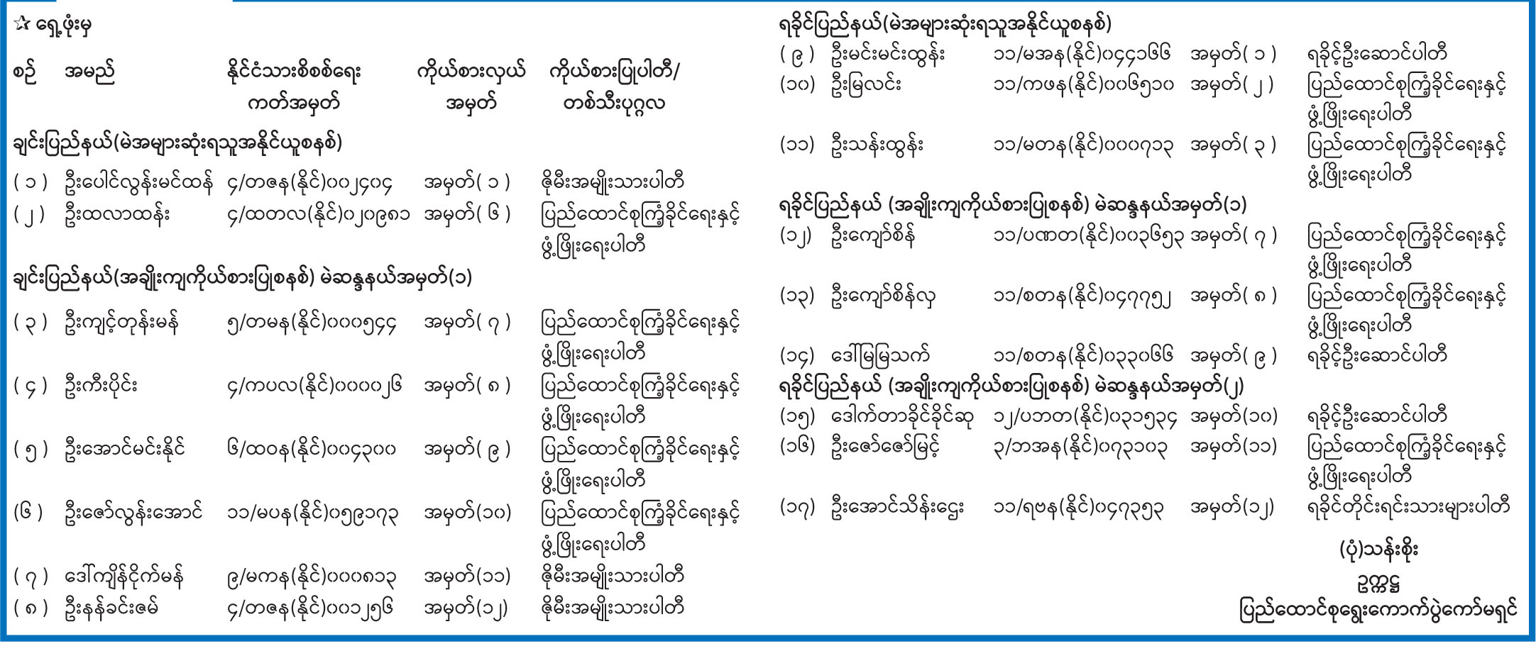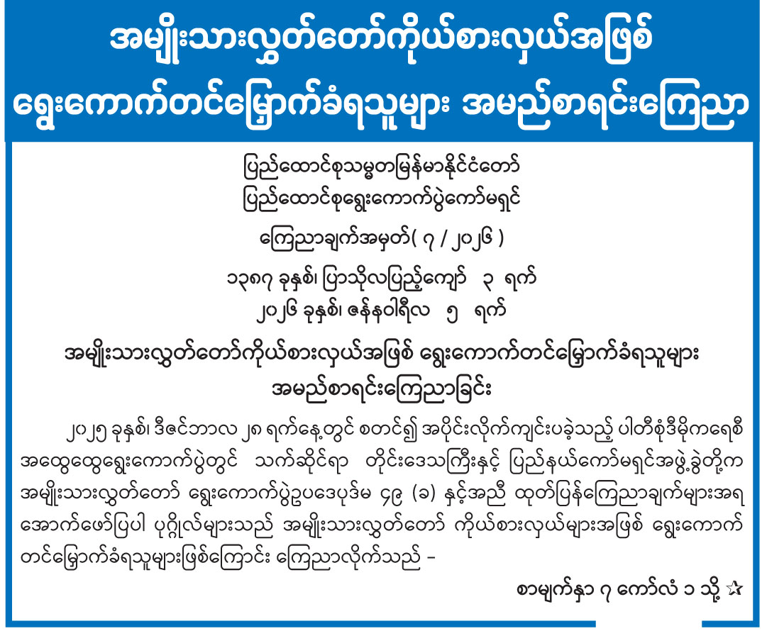 အမျိုးသားလွှတ်တော်ကိုယ်စားလှယ်အဖြစ် ရွေးကောက်တင်မြှောက်ခံရသူများ အမည်စာရင်းကြေညာ