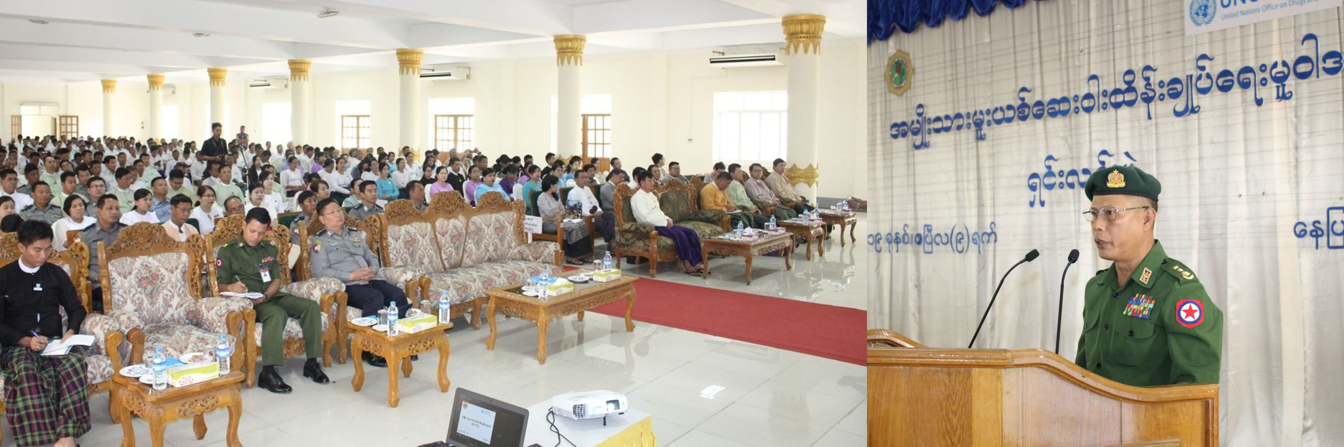 နေပြည်တော်၊ ပျဉ်းမနားမြို့နယ်ရှိ မင်္ဂလာဗျူဟာသာသနာ့ဗိမာန်၌ ယနေ့နံနက် ၉ နာရီတွင် အစိုးရဌာနများအတွင်း အမျိုးသားမူးယစ်ဆေးဝါး ထိန်းချုပ်ရေးမူဝါဒ ရှင်းလင်းပွဲအခမ်းအနား ပြုလုပ်ရာ အခမ်းအနားသို့ နေပြည်တော်ကောင်စီဝင် လုံခြုံရေးနှင့် နယ်စပ်ရေးရာဝန်ကြီး ဗိုလ်မှူးကြီးမင်းနောင်၊ နေပြည်တော် စည်ပင်သာယာရေးကော်မတီဝင် ဦးအေးမြင့်၊ နေပြည်တော် ရဲတပ်ဖွဲ့မှူး ရဲမှူးကြီးမျိုးဆွေနှင့် မူးယစ်ဆေးဝါးနှင့် စိတ်ကိုပြောင်းလဲစေသော ဆေးဝါးများအန္တရာယ် တားဆီးကာကွယ်ရေး ဗဟိုအဖွဲ့မှတာဝန်ရှိသူများ၊ လွှတ်တော်ကိုယ်စားလှယ်များ၊ နေပြည်တော်ကောင်စီနယ်မြေမှ မူးယစ်ဆေးဝါးနှင့် စိတ်ကိုပြောင်းလဲစေသော ဆေးဝါးများအန္တရာယ် တားဆီးကာကွယ်ရေး အဖွဲ့များ၊ NGO များမှ ကိုယ်စားလှယ်များနှင့် ကျွမ်းကျင်ပညာရှင်များ စုစုပေါင်း(၅၀ဝ)ခန့် တက်ရောက်ကြသည်။