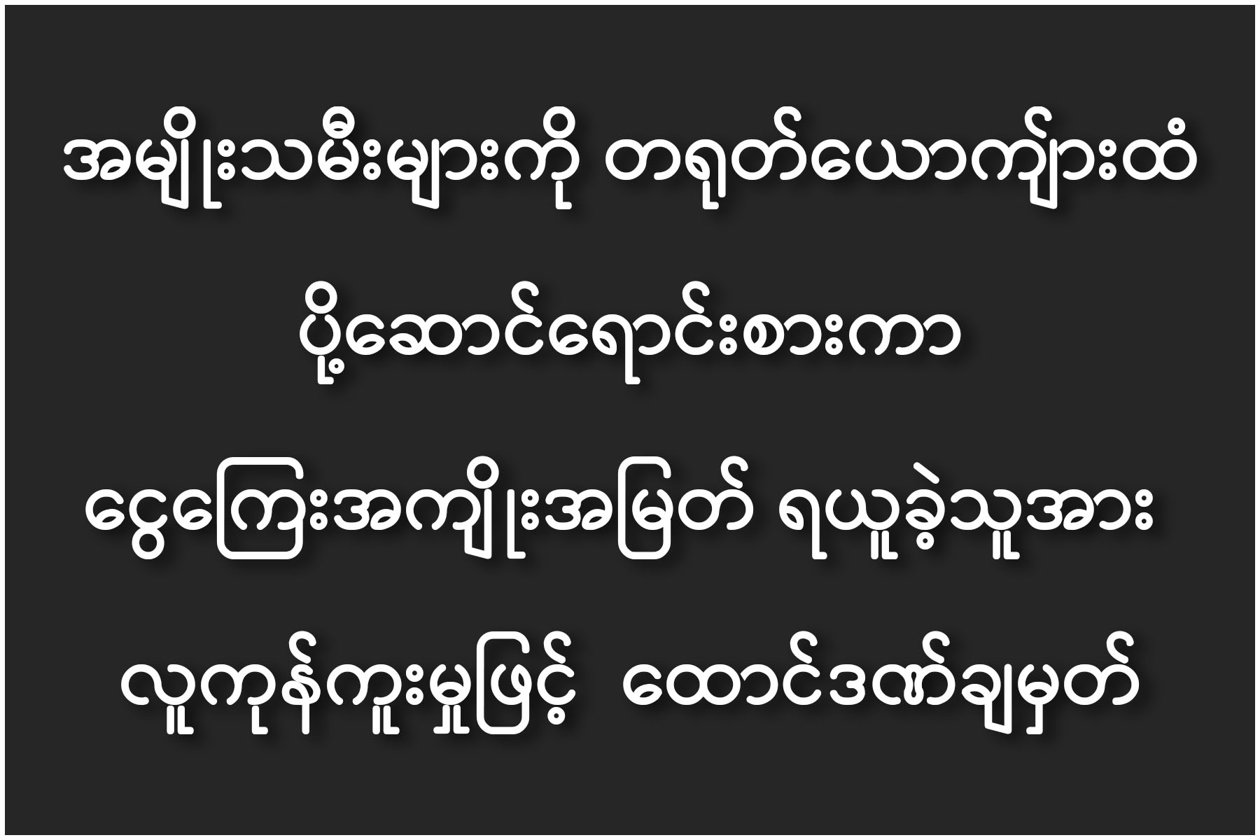 ရန်ကုန်တိုင်းဒေသကြီး၊ လှိုင်သာယာမြို့နယ်၊ အတွင်းပဒံရပ်ကွက်နေ အောင်ဇင်မင်း (ခ) အောင်ဇင်ဖြိုး (ခ) ကိုဖြိုးနှင့် ထန်းတပင်မြို့နယ်၊ တူးချောင်းရွာနေ ရန်မျိုးအောင် (ခ) ငြိမ်းမောင် (ခ) အေးမောင်တို့က ရန်ကုန်တိုင်းဒေသကြီး၊ ရွှေပြည်သာမြို့နယ်၊ ကျောင်းကုန်းရပ်ကွက်နေ မ ---၊ ၂၃ နှစ်၊ လှိုင်သာယာမြို့နယ်၊ ချောင်းဦးလမ်းနေ မ ---၊ ၂၂ နှစ်နှင့် ရွှေပြည်သာမြို့နယ်၊ ၁၁ ရပ်ကွက်နေ မ ---၊ ၂၄ နှစ်တို့အား တရုတ်ယောကျ်ားယူလျှင် သိန်း ၃၀ ကျပ်ရမည်ဖြစ်ပြီး တစ်နှစ်စာချုပ်ဖြင့် တရုတ်ပြည်တွင် နေထိုင်ရမည်ဟု ပြောဆိုစည်းရုံး၍ တရုတ်ယောကျ်ားထံ ပို့ဆောင်ရောင်းစားကာ ငွေကြေးအကျိုးအမြတ်များ ရယူခဲ့သဖြင့် ပြည်ကြီးတံခွန်မြို့မရဲစခန်း (ပ) ၅၃၃ /၂၀၂၀ လူကုန်ကူးမှု တားဆီးကာကွယ်ရေးဥပဒေပုဒ်မ ၂၄/၃၂ ဖြင့် အမှုရေးဖွင့်၍ မန္တလေးခရိုင် တရားရုံးသို့ တရားစွဲတင်ပို့ခဲ့ရာ အောက်တိုဘာ ၂၈ တွင် တရားခံ အောင်ဇင်မင်း (ခ) အောင်ဇင်ဖြိုး (ခ) ကိုဖြိုးနှင့် ရန်မျိုးအောင် (ခ) ငြိမ်းမောင် (ခ) အေးမောင်တို့အား လူကုန်ကူးမှုတားဆီး ကာကွယ်ရေးဥပဒေပုဒ်မ ၂၄ အရ အလုပ်နှင့် ထောင်ဒဏ် ၁၂ နှစ်စီ ကျခံစေရန် အမိန့်ချမှတ်ခဲ့ကြောင်း သိရသည်။