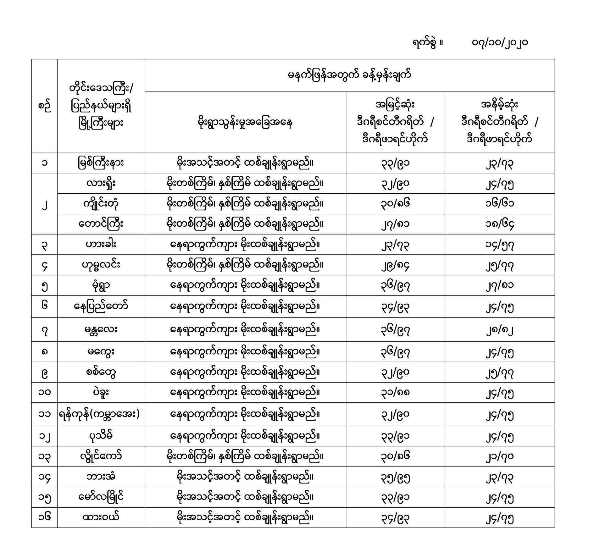 အောက်မှာဖော်ပြထားတာကတော့ မနက်ဖြန်အတွက် တိုင်းဒေသကြီးနှင့် ပြည်နယ်များရှိ မြို့ကြီးများ၏ အမြင့်ဆုံးအပူချိန်၊ အနိမ့်ဆုံးအပူချိန်နှင့် မိုးလေဝသခန့်မှန်းချက်တို့ပဲဖြစ်ပါတယ်-