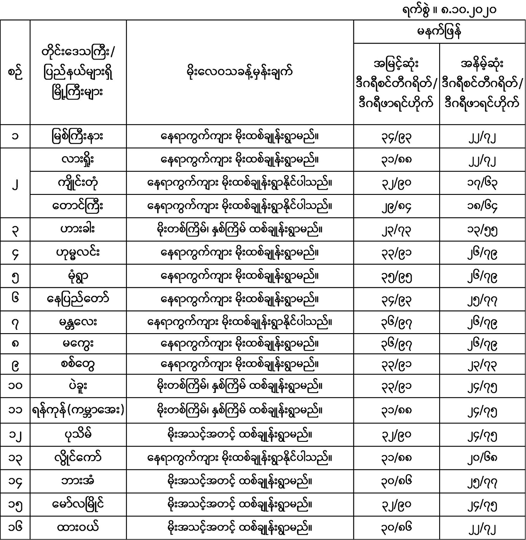အောက်မှာဖော်ပြထားတာကတော့ မနက်ဖြန်အတွက် တိုင်းဒေသကြီးနှင့် ပြည်နယ်များရှိ မြို့ကြီးများ၏ အမြင့်ဆုံးအပူချိန်၊ အနိမ့်ဆုံးအပူချိန်နှင့် မိုးလေဝသခန့်မှန်းချက်တို့ပဲဖြစ်ပါသည်။