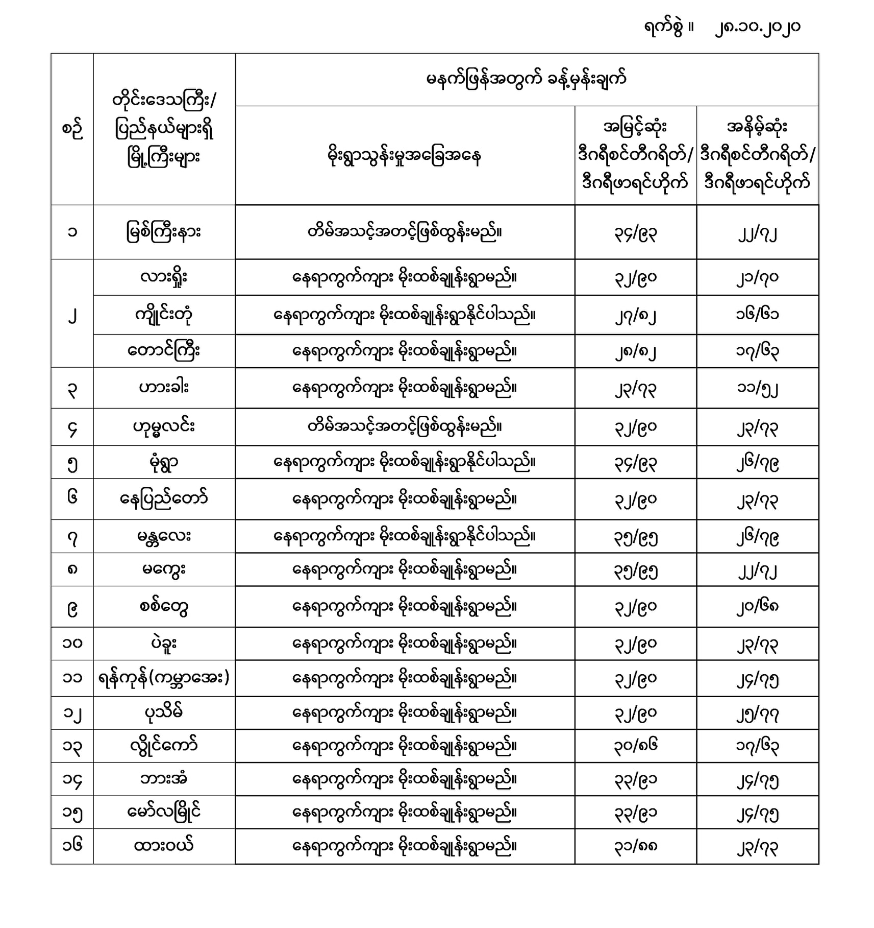 အောက်မှာဖော်ပြထားတာကတော့ မနက်ဖြန်အတွက် တိုင်းဒေသကြီးနှင့် ပြည်နယ်များရှိ မြို့ကြီးများ၏ အမြင့်ဆုံးအပူချိန်၊ အနိမ့်ဆုံးအပူချိန်နှင့် မိုးလေဝသခန့်မှန်းချက်တို့ပဲဖြစ်ပါတယ်။