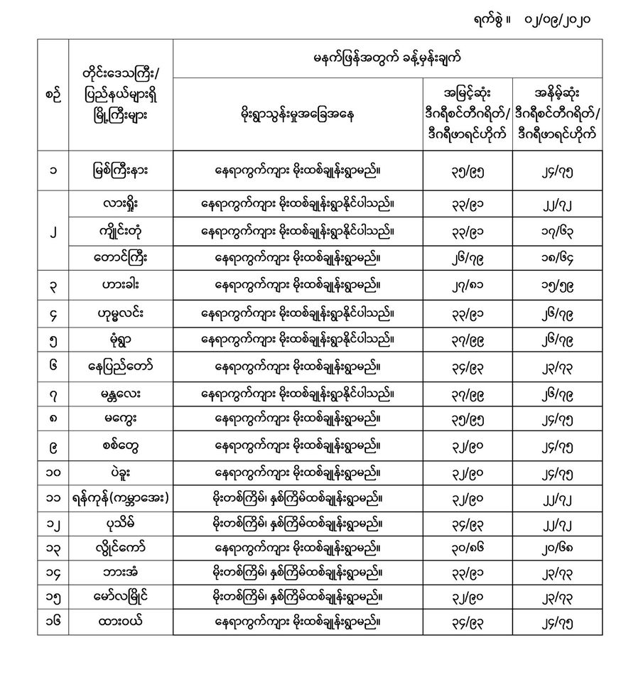 အောက်မှာဖော်ပြထားတာကတော့ မနက်ဖြန်အတွက် တိုင်းဒေသကြီးနှင့် ပြည်နယ်များရှိ မြို့ကြီးများ၏ အမြင့်ဆုံးအပူချိန်၊ အနိမ့်ဆုံးအပူချိန်နှင့် မိုးလေဝသခန့်မှန်းချက်တို့ပဲဖြစ်ပါတယ်။