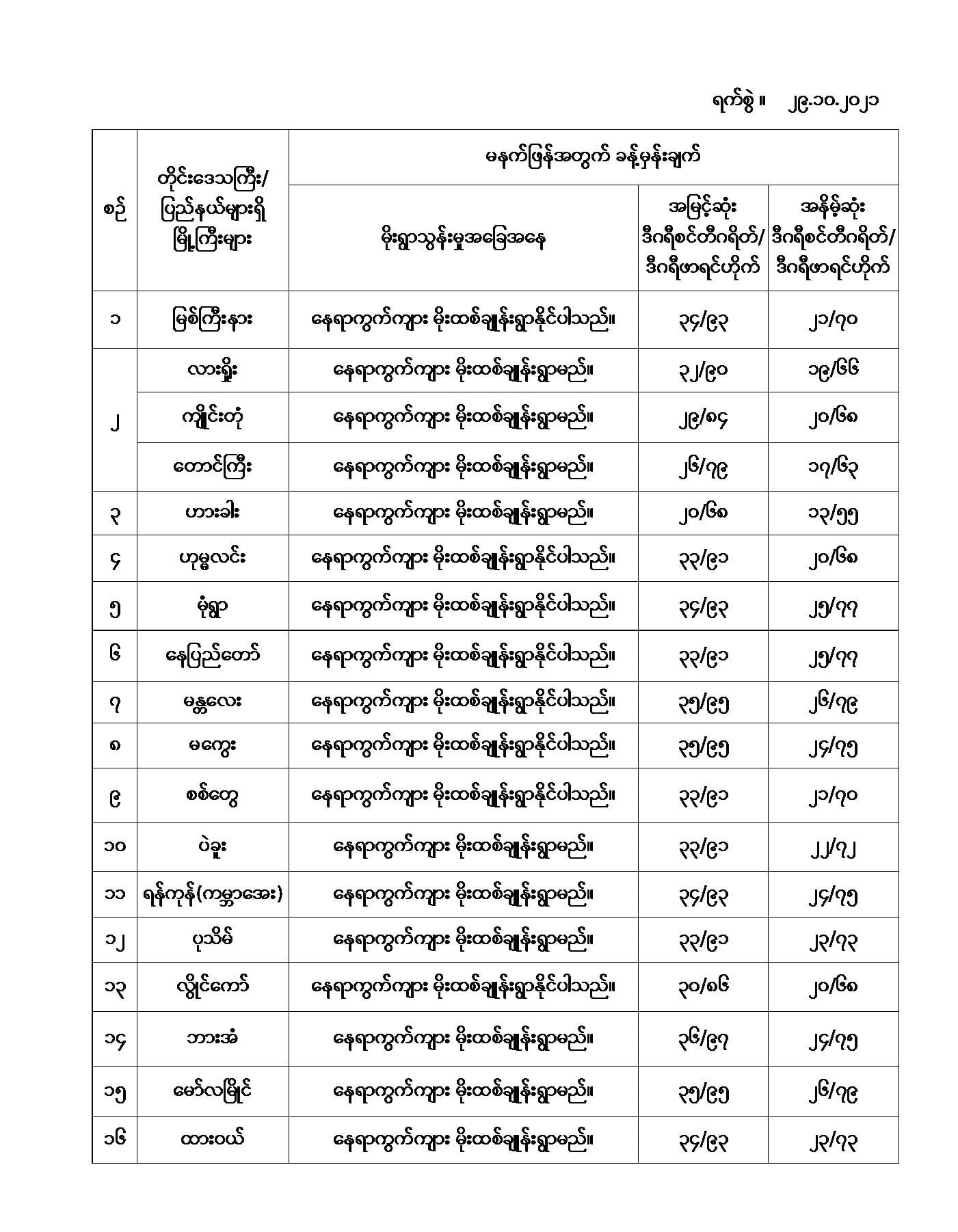 အောက်မှာဖော်ပြထားတာကတော့ မနက်ဖြန်အတွက် တိုင်းဒေသကြီးနှင့် ပြည်နယ်များရှိ မြို့ကြီးများ၏ အမြင့်ဆုံးအပူချိန်၊ အနိမ့်ဆုံးအပူချိန်နှင့် မိုးလေဝသခန့်မှန်းချက်တို့ပဲဖြစ်ပါတယ်---