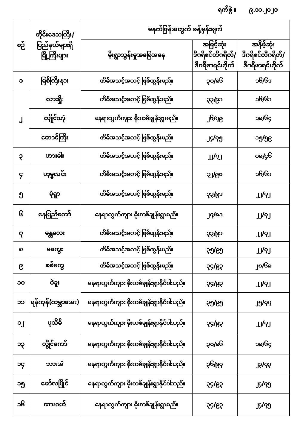 အောက်မှာဖော်ပြထားတာကတော့ မနက်ဖြန်အတွက် တိုင်းဒေသကြီးနှင့် ပြည်နယ်များရှိ မြို့ကြီးများ၏ အမြင့်ဆုံးအပူချိန်၊ အနိမ့်ဆုံးအပူချိန်နှင့် မိုးလေဝသခန့်မှန်းချက်တို့ပဲဖြစ်ပါတယ်---