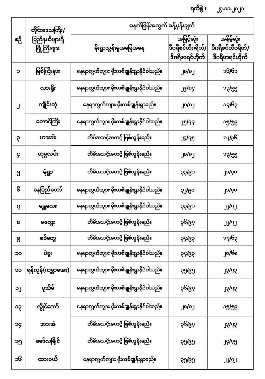 အောက်မှာဖော်ပြထားတာကတော့ မနက်ဖြန်အတွက် တိုင်းဒေသကြီးနှင့် ပြည်နယ်များရှိ မြို့ကြီးများ၏ အမြင့်ဆုံးအပူချိန်၊ အနိမ့်ဆုံးအပူချိန်နှင့် မိုးလေဝသခန့်မှန်းချက်တို့ပဲဖြစ်ပါတယ်---