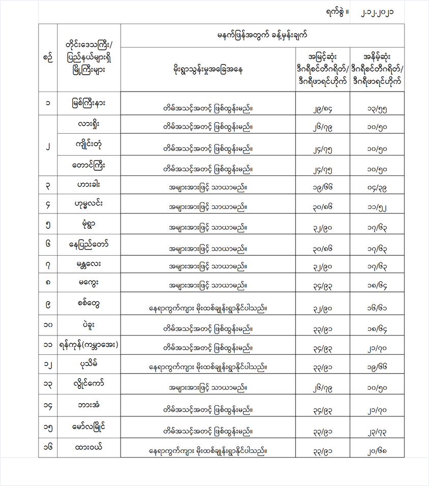 အောက်မှာဖော်ပြထားတာကတော့ မနက်ဖြန်အတွက် တိုင်းဒေသကြီးနှင့် ပြည်နယ်များရှိ မြို့ကြီးများ၏ အမြင့်ဆုံးအပူချိန်၊ အနိမ့်ဆုံးအပူချိန်နှင့် မိုးလေဝသခန့်မှန်းချက်တို့ပဲဖြစ်ပါတယ်---