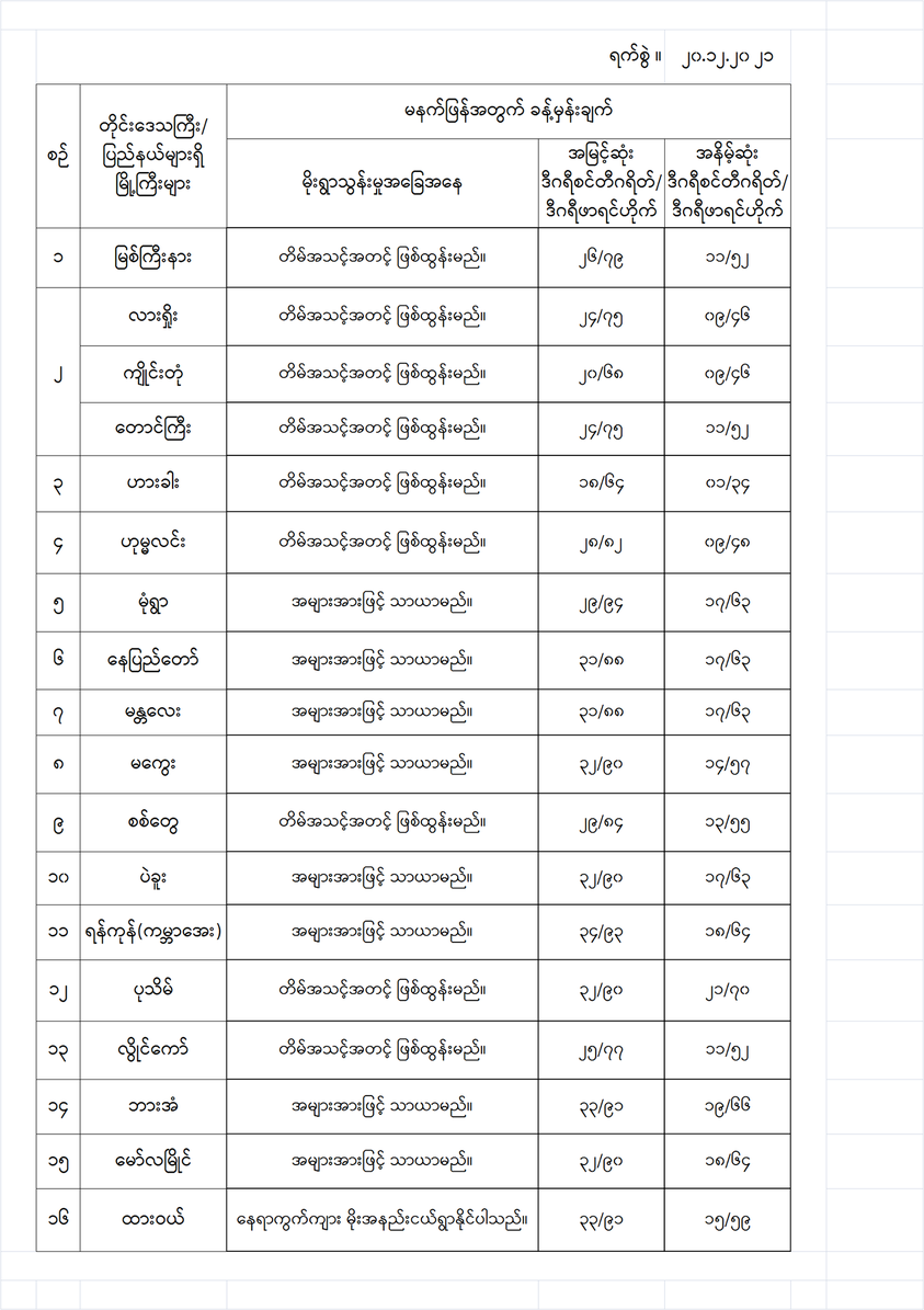 အောက်မှာဖော်ပြထားတာကတော့ မနက်ဖြန်အတွက် တိုင်းဒေသကြီးနှင့် ပြည်နယ်များရှိ မြို့ကြီးများ၏ အမြင့်ဆုံးအပူချိန်၊ အနိမ့်ဆုံးအပူချိန်နှင့် မိုးလေဝသခန့်မှန်းချက်တို့ပဲဖြစ်ပါတယ်---