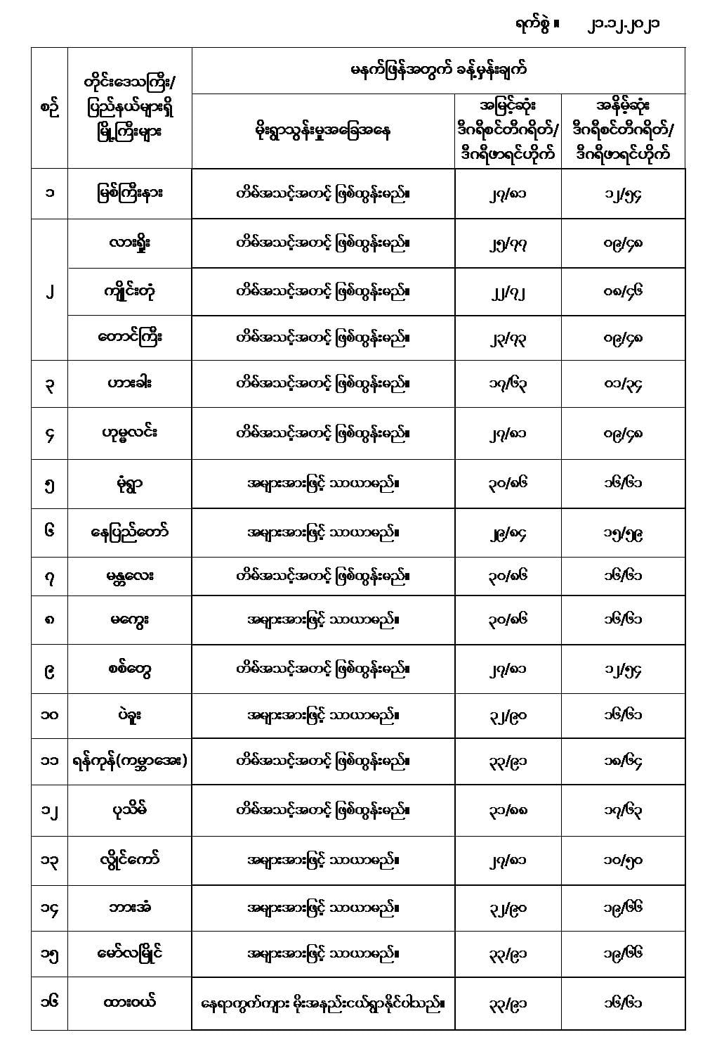 အောက်မှာဖော်ပြထားတာကတော့ မနက်ဖြန်အတွက် တိုင်းဒေသကြီးနှင့် ပြည်နယ်များရှိ မြို့ကြီးများ၏ အမြင့်ဆုံးအပူချိန်၊ အနိမ့်ဆုံးအပူချိန်နှင့် မိုးလေဝသခန့်မှန်းချက်တို့ပဲဖြစ်ပါတယ်---