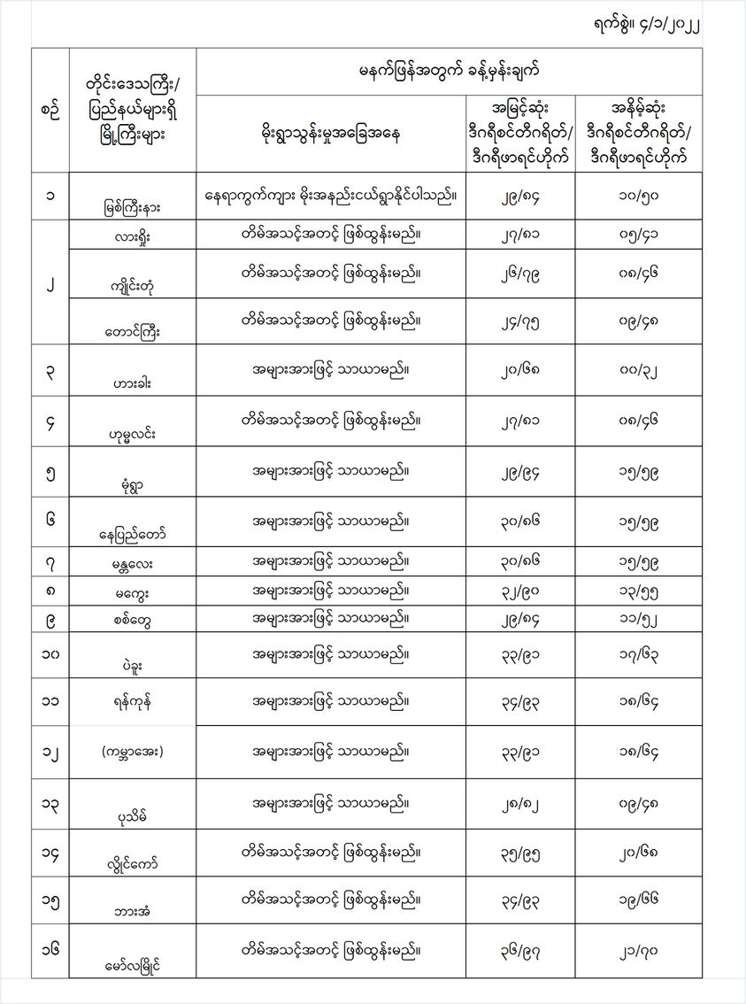 အောက်မှာဖော်ပြထားတာကတော့ မနက်ဖြန်အတွက် တိုင်းဒေသကြီးနှင့် ပြည်နယ်များရှိ မြို့ကြီးများ၏ အမြင့်ဆုံးအပူချိန်၊ အနိမ့်ဆုံးအပူချိန်နှင့် မိုးလေဝသခန့်မှန်းချက်တို့ပဲဖြစ်ပါတယ်---