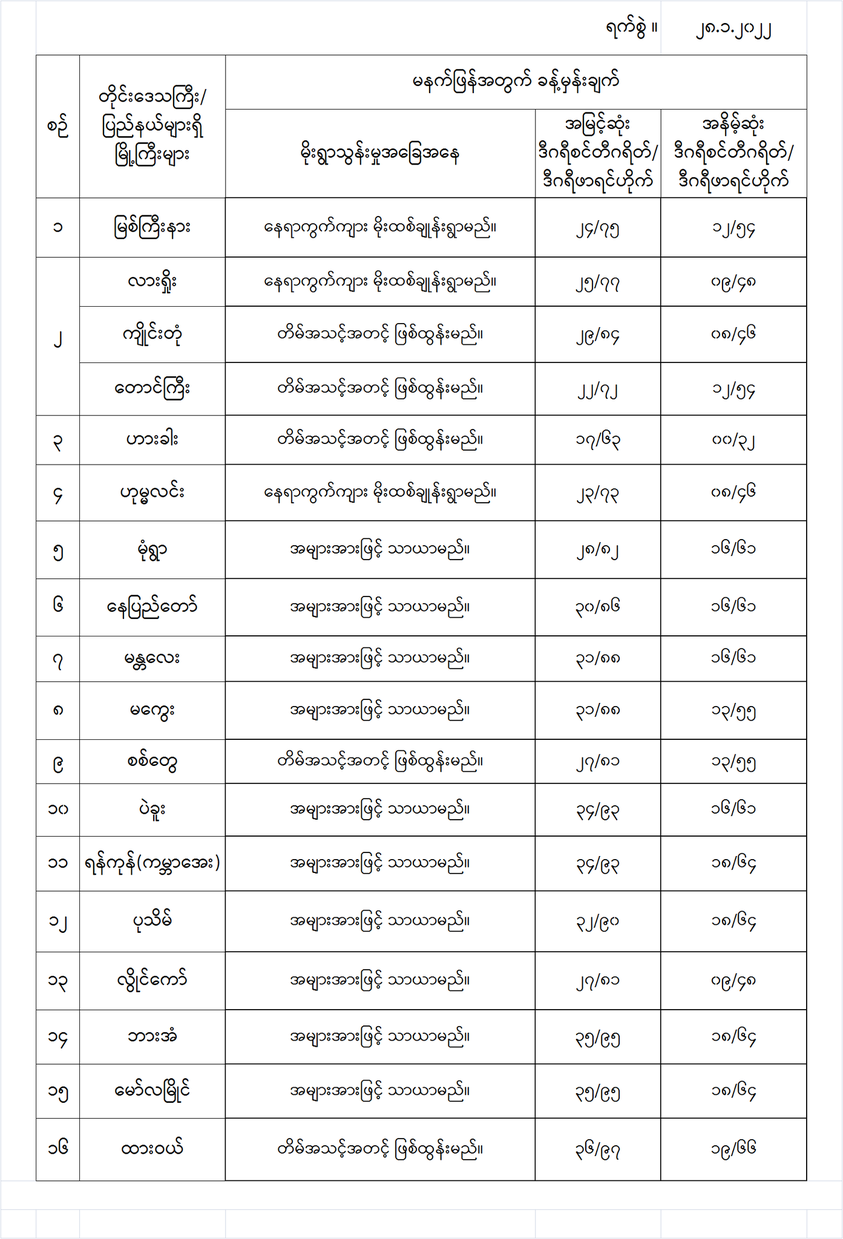 အောက်မှာဖော်ပြထားတာကတော့ မနက်ဖြန်အတွက် တိုင်းဒေသကြီးနှင့် ပြည်နယ်များရှိ မြို့ကြီးများ၏ အမြင့်ဆုံးအပူချိန်၊ အနိမ့်ဆုံးအပူချိန်နှင့် မိုးလေဝသခန့်မှန်းချက်တို့ပဲဖြစ်ပါတယ်---