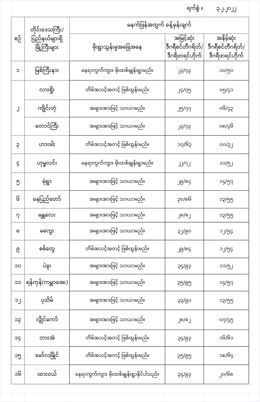 အောက်မှာဖော်ပြထားတာကတော့ မနက်ဖြန်အတွက် တိုင်းဒေသကြီးနှင့် ပြည်နယ်များရှိ မြို့ကြီးများ၏ အမြင့်ဆုံးအပူချိန်၊ အနိမ့်ဆုံးအပူချိန်နှင့် မိုးလေဝသခန့်မှန်းချက်တို့ပဲဖြစ်ပါတယ်---