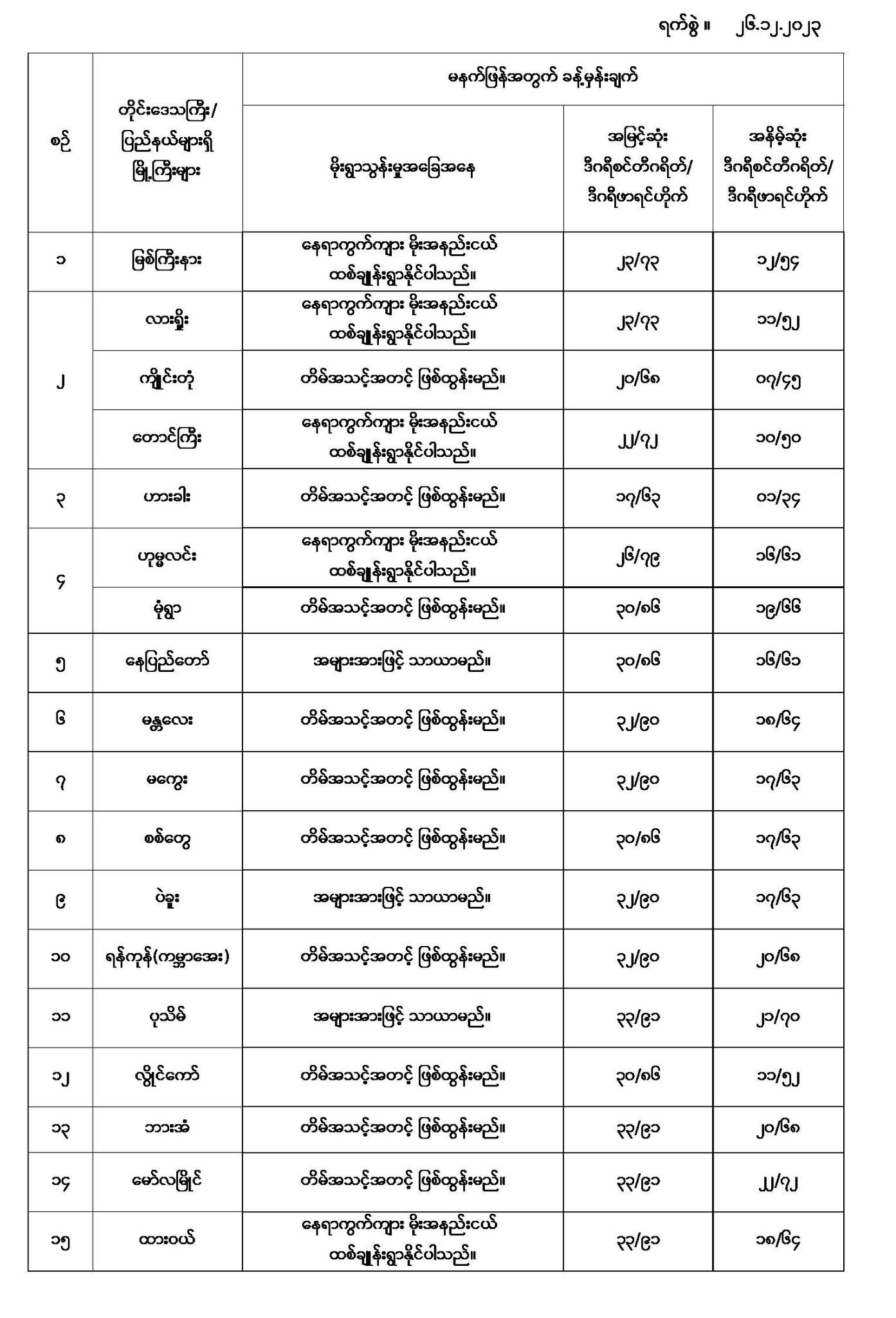 အောက်မှာဖော်ပြထားတာကတော့ မနက်ဖြန်အတွက် တိုင်းဒေသကြီးနှင့် ပြည်နယ်များရှိ မြို့ကြီးများ၏ အမြင့်ဆုံးအပူချိန်၊ အနိမ့်ဆုံးအပူချိန်နှင့် မိုးလေဝသခန့်မှန်းချက်တို့ပဲဖြစ်ပါတယ်-------