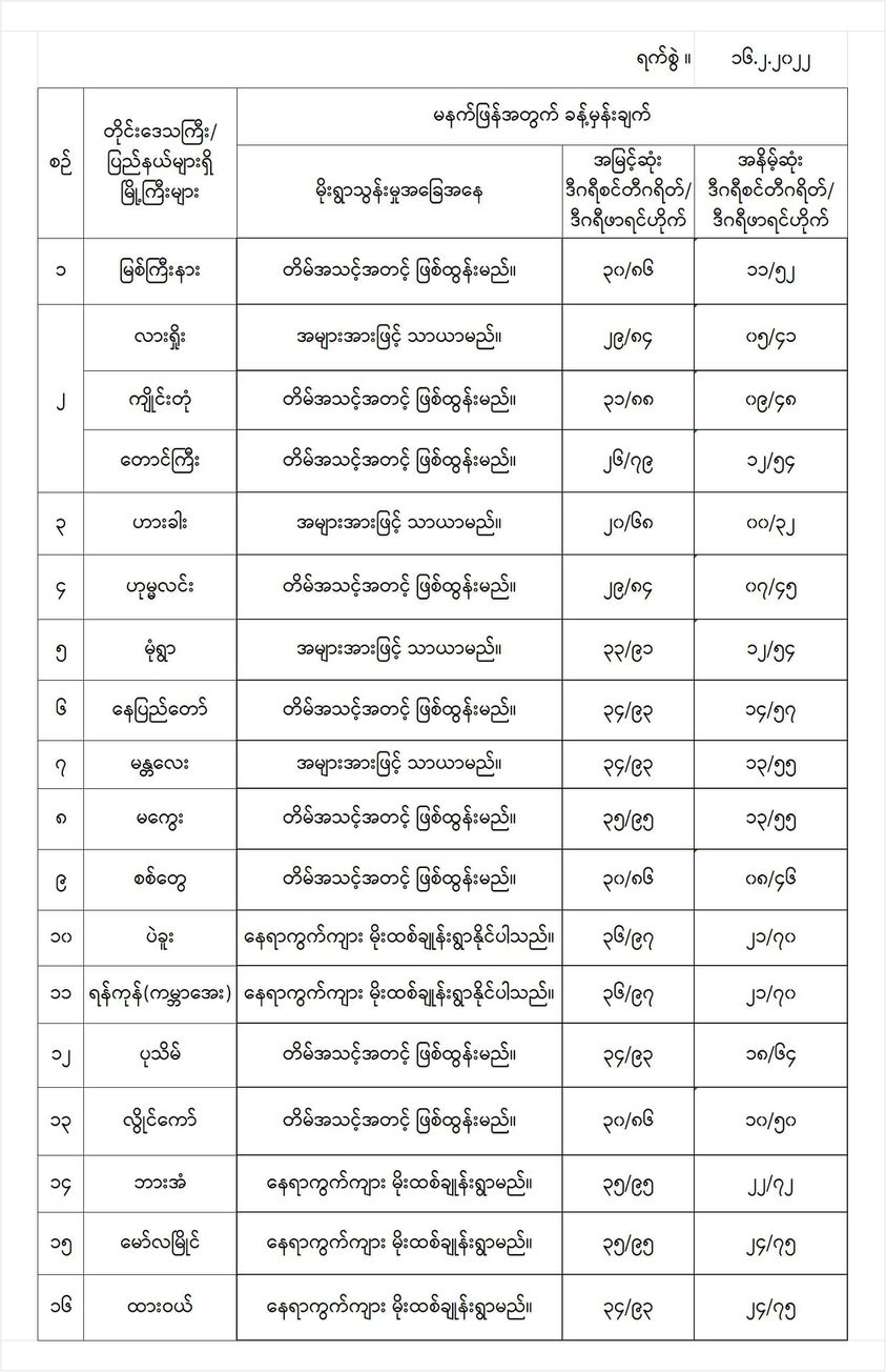အောက်မှာဖော်ပြထားတာကတော့ မနက်ဖြန်အတွက် တိုင်းဒေသကြီးနှင့် ပြည်နယ်များရှိ မြို့ကြီးများ၏ အမြင့်ဆုံးအပူချိန်၊ အနိမ့်ဆုံးအပူချိန်နှင့် မိုးလေဝသခန့်မှန်းချက်တို့ပဲဖြစ်ပါတယ်---