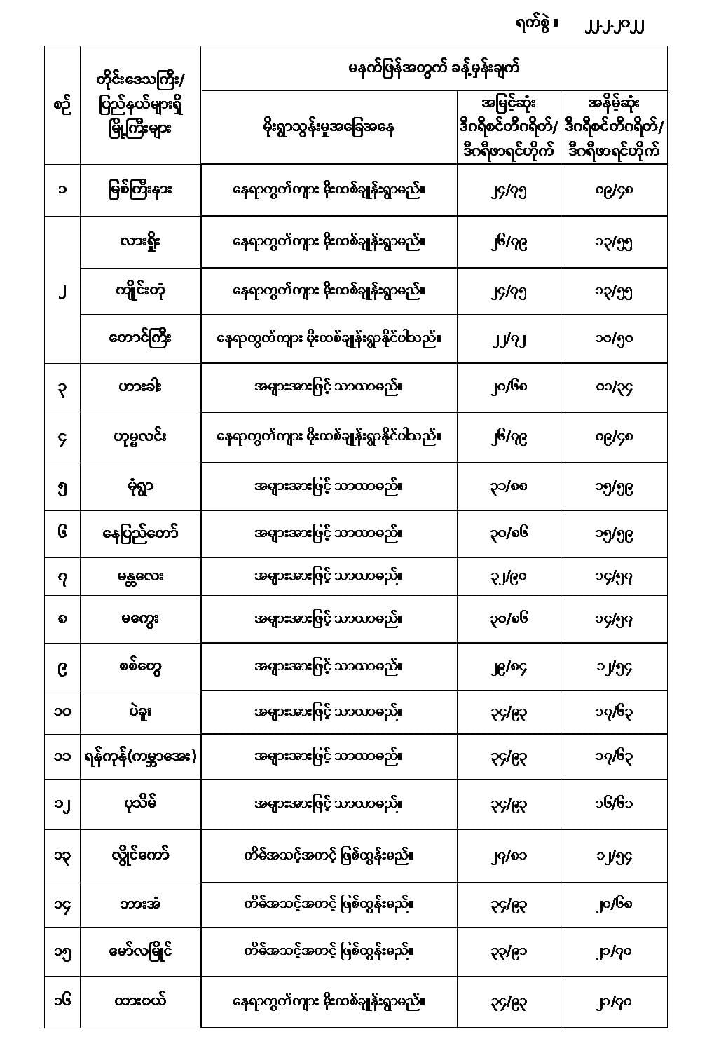 အောက်မှာဖော်ပြထားတာကတော့ မနက်ဖြန်အတွက် တိုင်းဒေသကြီးနှင့် ပြည်နယ်များရှိ မြို့ကြီးများ၏ အမြင့်ဆုံးအပူချိန်၊ အနိမ့်ဆုံးအပူချိန်နှင့် မိုးလေဝသခန့်မှန်းချက်တို့ပဲဖြစ်ပါတယ်---