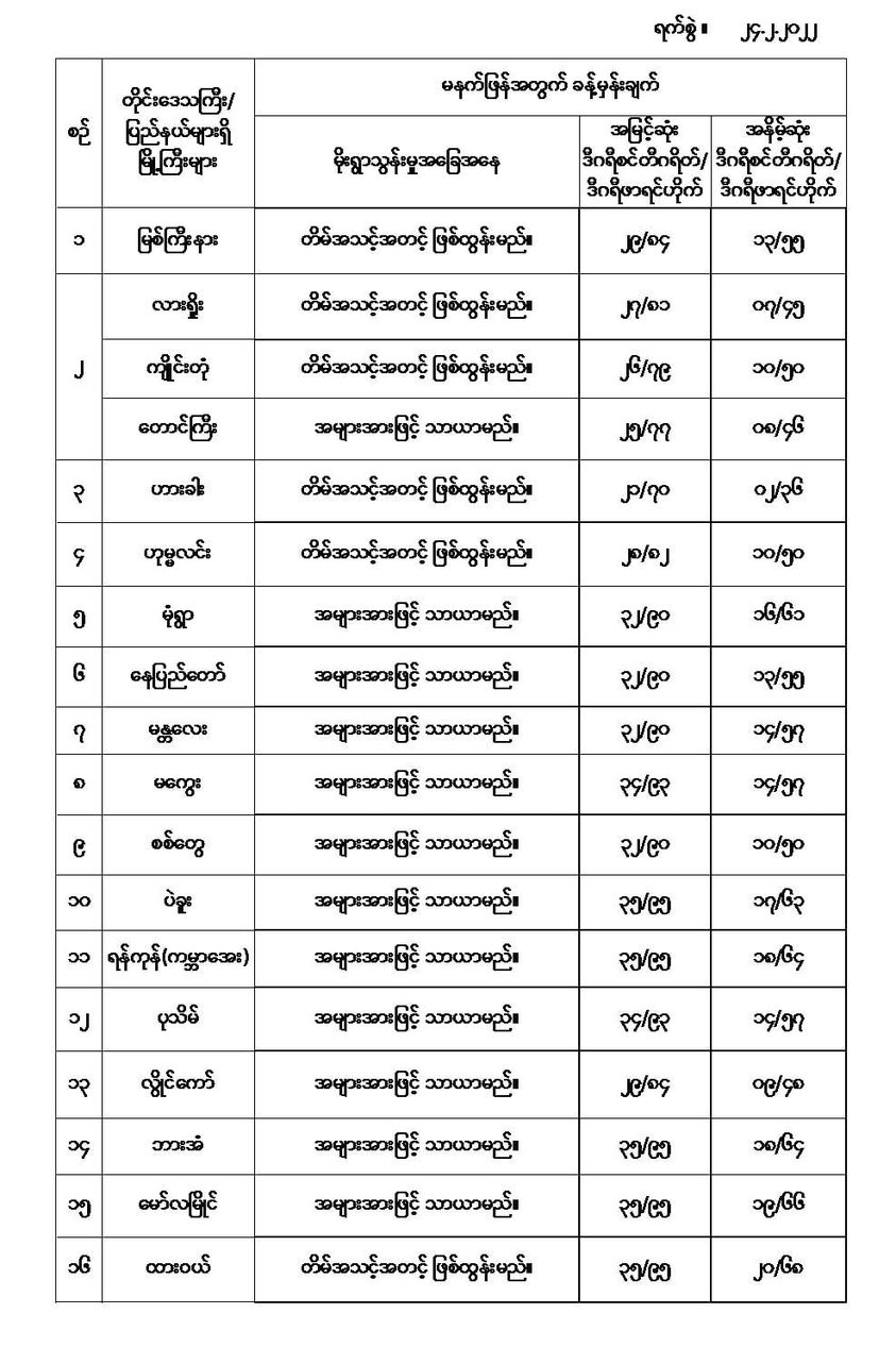 အောက်မှာဖော်ပြထားတာကတော့ မနက်ဖြန်အတွက် တိုင်းဒေသကြီးနှင့် ပြည်နယ်များရှိ မြို့ကြီးများ၏ အမြင့်ဆုံးအပူချိန်၊ အနိမ့်ဆုံးအပူချိန်နှင့် မိုးလေဝသခန့်မှန်းချက်တို့ပဲဖြစ်ပါတယ်---