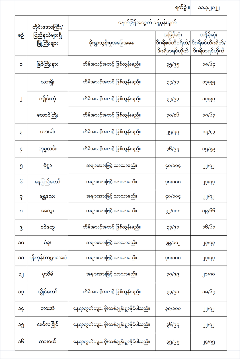 အောက်မှာဖော်ပြထားတာကတော့ မနက်ဖြန်အတွက် တိုင်းဒေသကြီးနှင့် ပြည်နယ်များရှိ မြို့ကြီးများ၏ အမြင့်ဆုံးအပူချိန်၊ အနိမ့်ဆုံးအပူချိန်နှင့် မိုးလေဝသခန့်မှန်းချက်တို့ပဲဖြစ်ပါတယ်---