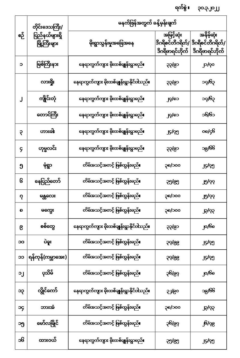 အောက်မှာဖော်ပြထားတာကတော့ မနက်ဖြန်အတွက် တိုင်းဒေသကြီးနှင့် ပြည်နယ်များရှိ မြို့ကြီးများ၏ အမြင့်ဆုံးအပူချိန်၊ အနိမ့်ဆုံးအပူချိန်နှင့် မိုးလေဝသခန့်မှန်းချက်တို့ပဲဖြစ်ပါတယ်---