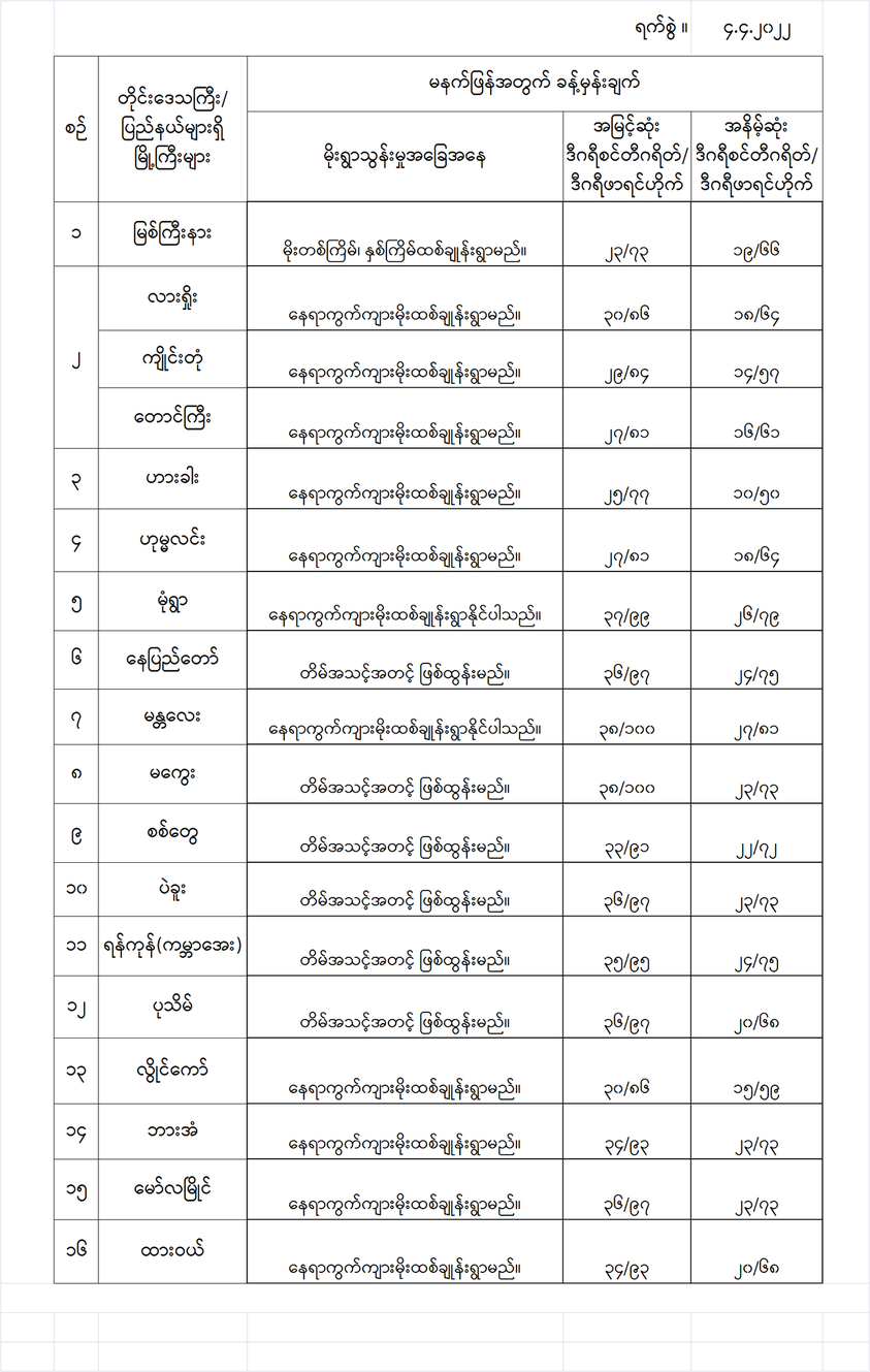 အောက်မှာဖော်ပြထားတာကတော့ မနက်ဖြန်အတွက် တိုင်းဒေသကြီးနှင့် ပြည်နယ်များရှိ မြို့ကြီးများ၏ အမြင့်ဆုံးအပူချိန်၊ အနိမ့်ဆုံးအပူချိန်နှင့် မိုးလေဝသခန့်မှန်းချက်တို့ပဲဖြစ်ပါတယ်---