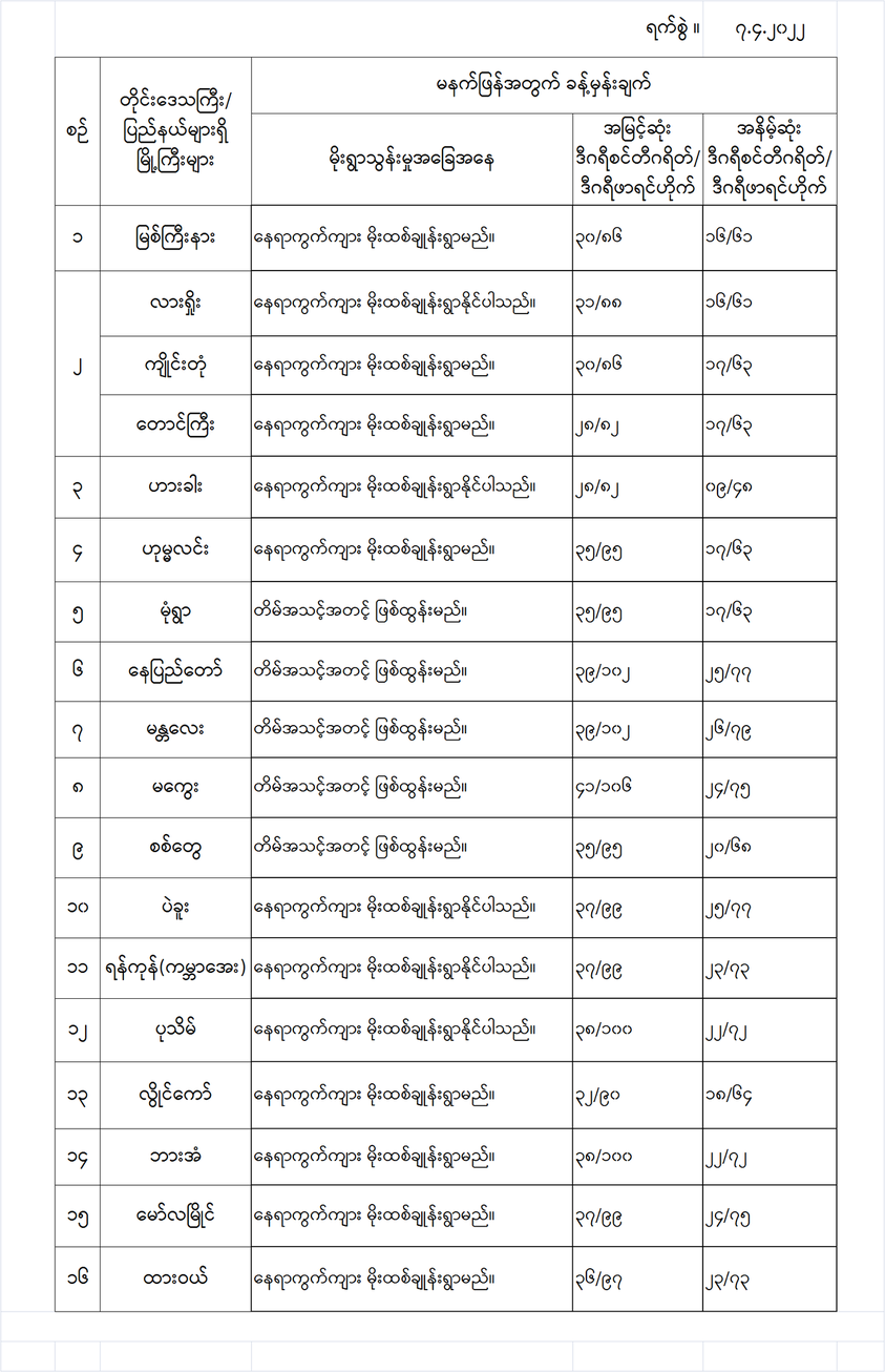 အောက်မှာဖော်ပြထားတာကတော့ မနက်ဖြန်အတွက် တိုင်းဒေသကြီးနှင့် ပြည်နယ်များရှိ မြို့ကြီးများ၏ အမြင့်ဆုံးအပူချိန်၊ အနိမ့်ဆုံးအပူချိန်နှင့် မိုးလေဝသခန့်မှန်းချက်တို့ပဲဖြစ်ပါတယ်---