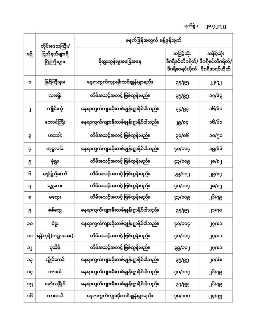 အောက်မှာဖော်ပြထားတာကတော့ မနက်ဖြန်အတွက် တိုင်းဒေသကြီးနှင့် ပြည်နယ်များရှိ မြို့ကြီးများ၏ အမြင့်ဆုံးအပူချိန်၊ အနိမ့်ဆုံးအပူချိန်နှင့် မိုးလေဝသခန့်မှန်းချက်တို့ပဲဖြစ်ပါတယ်---