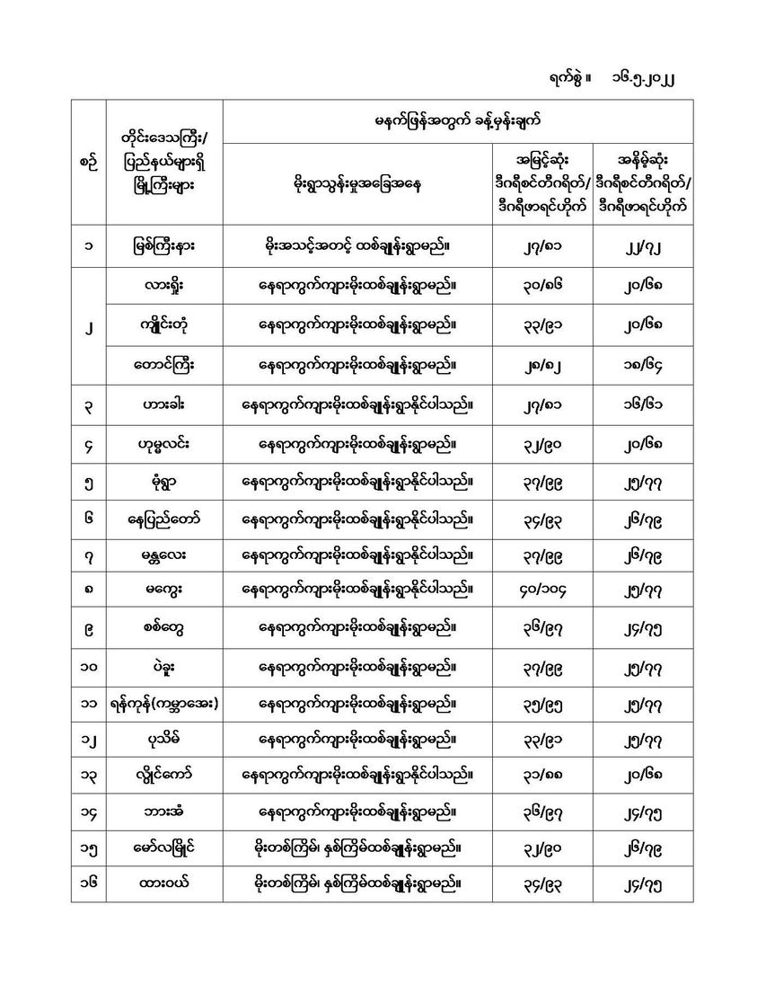 အောက်မှာဖော်ပြထားတာကတော့ မနက်ဖြန်အတွက် တိုင်းဒေသကြီးနှင့် ပြည်နယ်များရှိ မြို့ကြီးများ၏ အမြင့်ဆုံးအပူချိန်၊ အနိမ့်ဆုံးအပူချိန်နှင့် မိုးလေဝသခန့်မှန်းချက်တို့ပဲဖြစ်ပါတယ်---
