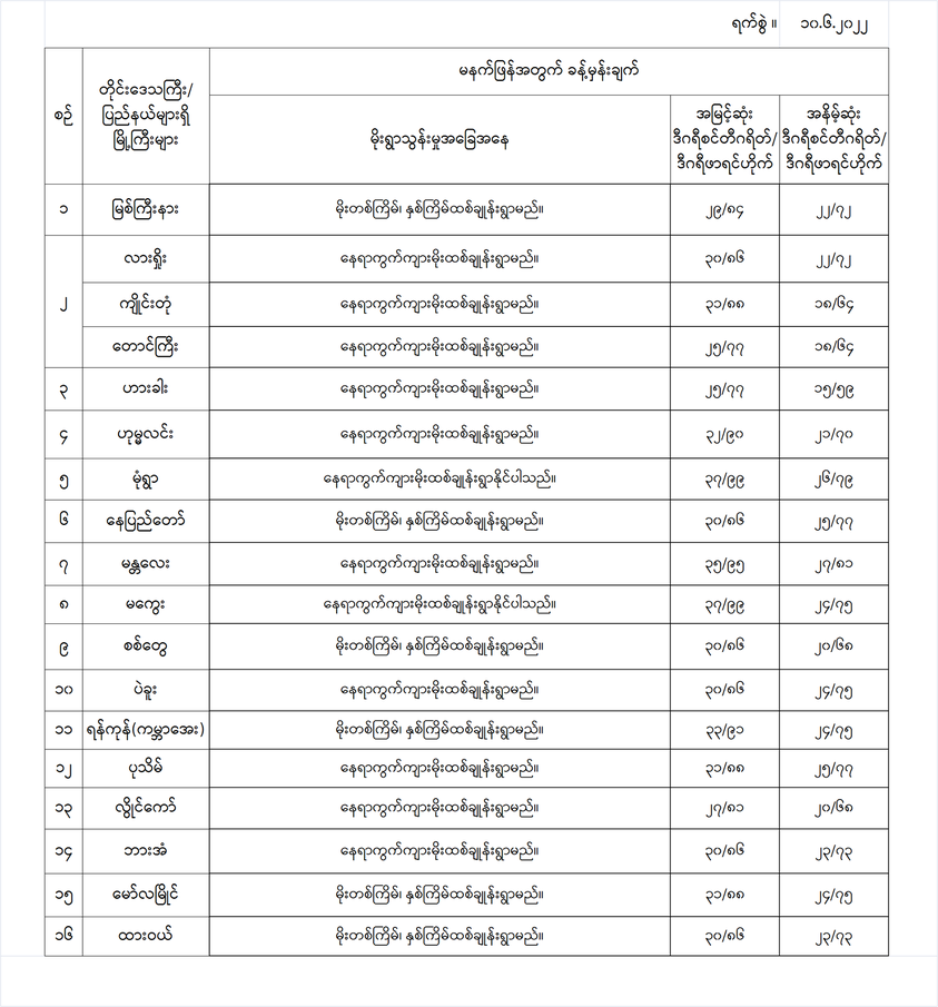 အောက်မှာဖော်ပြထားတာကတော့ မနက်ဖြန်အတွက် တိုင်းဒေသကြီးနှင့် ပြည်နယ်များရှိ မြို့ကြီးများ၏ အမြင့်ဆုံးအပူချိန်၊ အနိမ့်ဆုံးအပူချိန်နှင့် မိုးလေဝသခန့်မှန်းချက်တို့ပဲဖြစ်ပါတယ်---