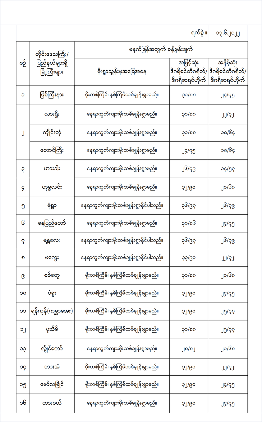 အောက်မှာဖော်ပြထားတာကတော့ မနက်ဖြန်အတွက် တိုင်းဒေသကြီးနှင့် ပြည်နယ်များရှိ မြို့ကြီးများ၏ အမြင့်ဆုံးအပူချိန်၊ အနိမ့်ဆုံးအပူချိန်နှင့် မိုးလေဝသခန့်မှန်းချက်တို့ပဲဖြစ်ပါတယ်---