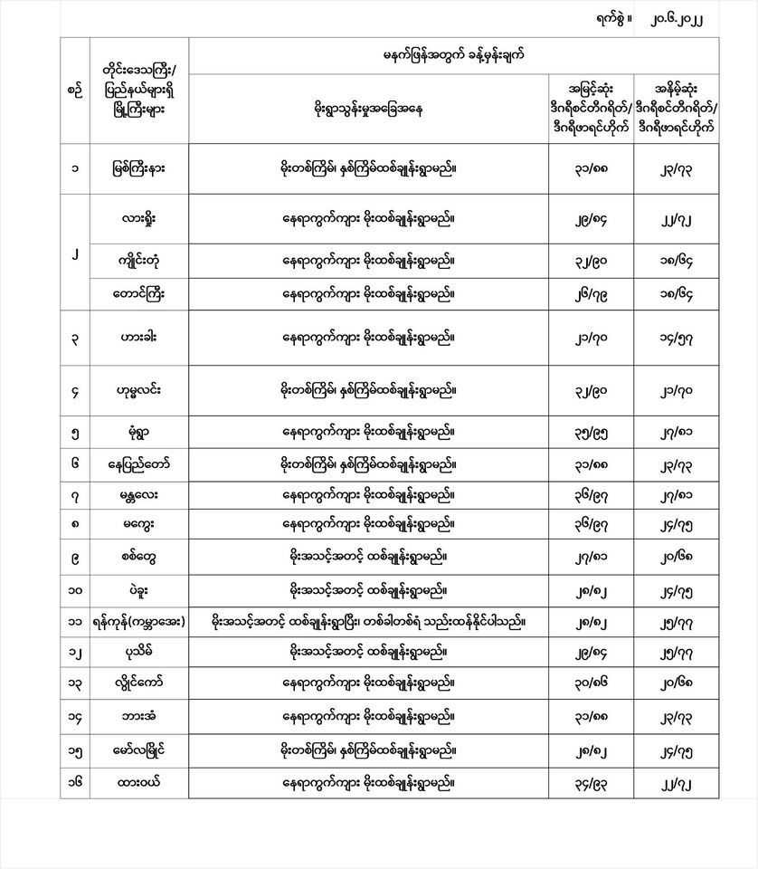 အောက်မှာဖော်ပြထားတာကတော့ မနက်ဖြန်အတွက် တိုင်းဒေသကြီးနှင့် ပြည်နယ်များရှိ မြို့ကြီးများ၏ အမြင့်ဆုံးအပူချိန်၊ အနိမ့်ဆုံးအပူချိန်နှင့် မိုးလေဝသခန့်မှန်းချက်တို့ပဲဖြစ်ပါတယ်---
