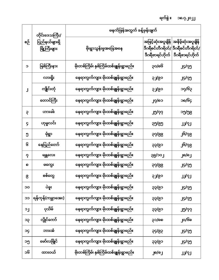 အောက်မှာဖော်ပြထားတာကတော့ မနက်ဖြန်အတွက် တိုင်းဒေသကြီးနှင့် ပြည်နယ်များရှိ မြို့ကြီးများ၏ အမြင့်ဆုံးအပူချိန်၊ အနိမ့်ဆုံးအပူချိန်နှင့် မိုးလေဝသခန့်မှန်းချက်တို့ပဲဖြစ်ပါတယ်---