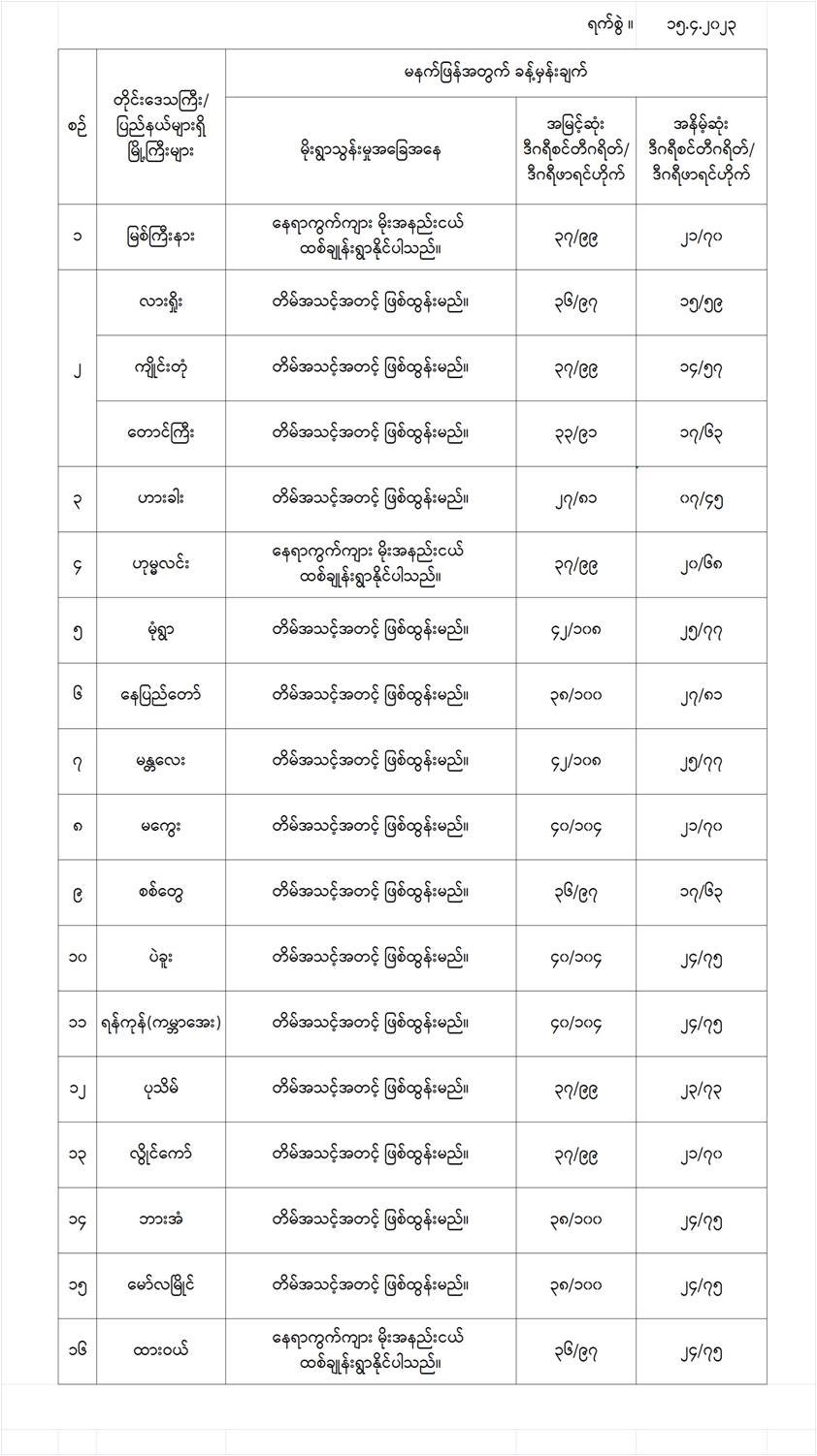 အောက်မှာဖော်ပြထားတာကတော့ မနက်ဖြန်အတွက် တိုင်းဒေသကြီးနှင့် ပြည်နယ်များရှိ မြို့ကြီးများ၏ အမြင့်ဆုံးအပူချိန်၊ အနိမ့်ဆုံးအပူချိန်နှင့် မိုးလေဝသခန့်မှန်းချက်တို့ပဲဖြစ်ပါတယ်---