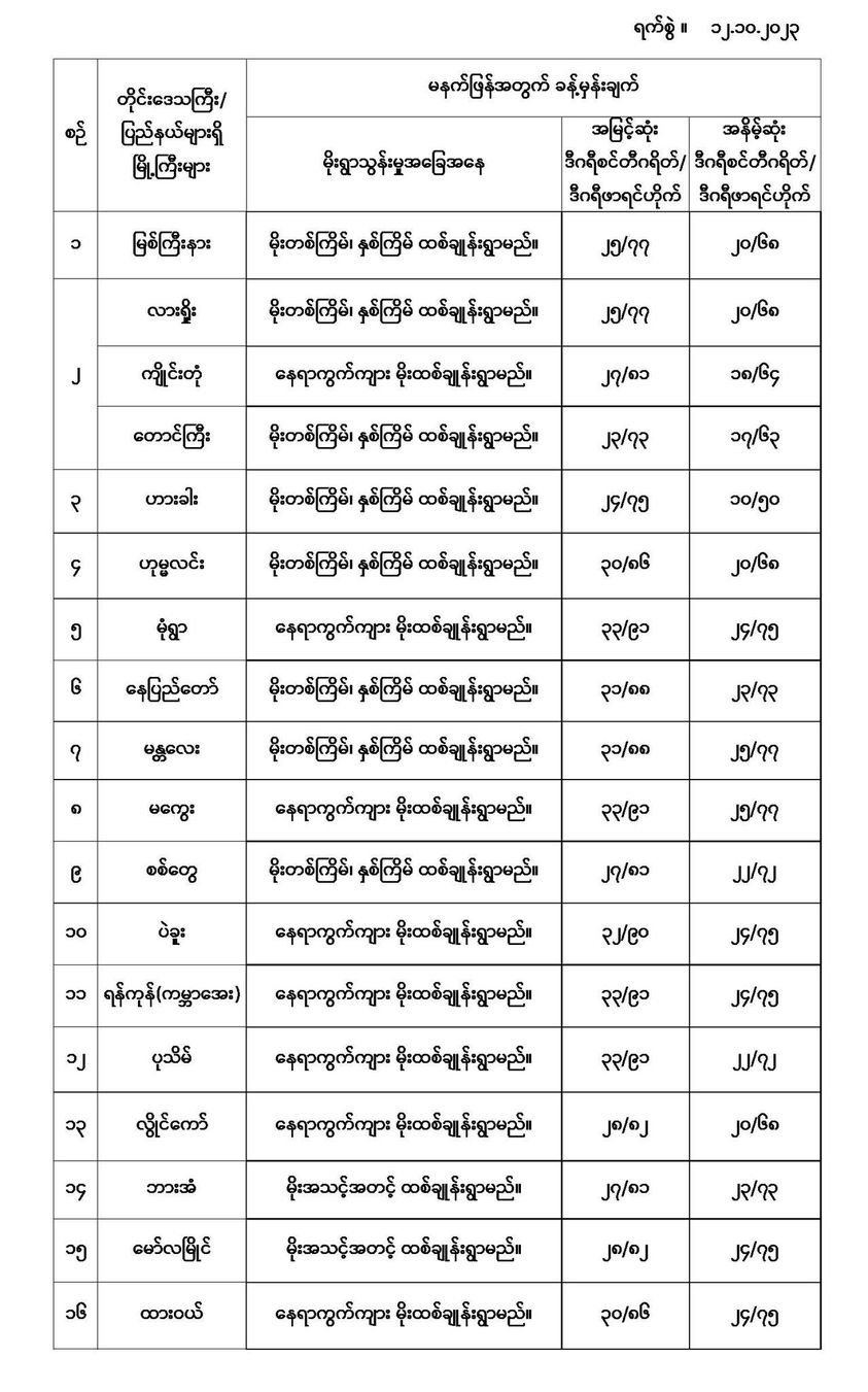 အောက်မှာဖော်ပြထားတာကတော့ မနက်ဖြန်အတွက် တိုင်းဒေသကြီးနှင့် ပြည်နယ်များရှိ မြို့ကြီးများ၏ အမြင့်ဆုံးအပူချိန်၊ အနိမ့်ဆုံးအပူချိန်နှင့် မိုးလေဝသခန့်မှန်းချက်တို့ပဲဖြစ်ပါတယ်---