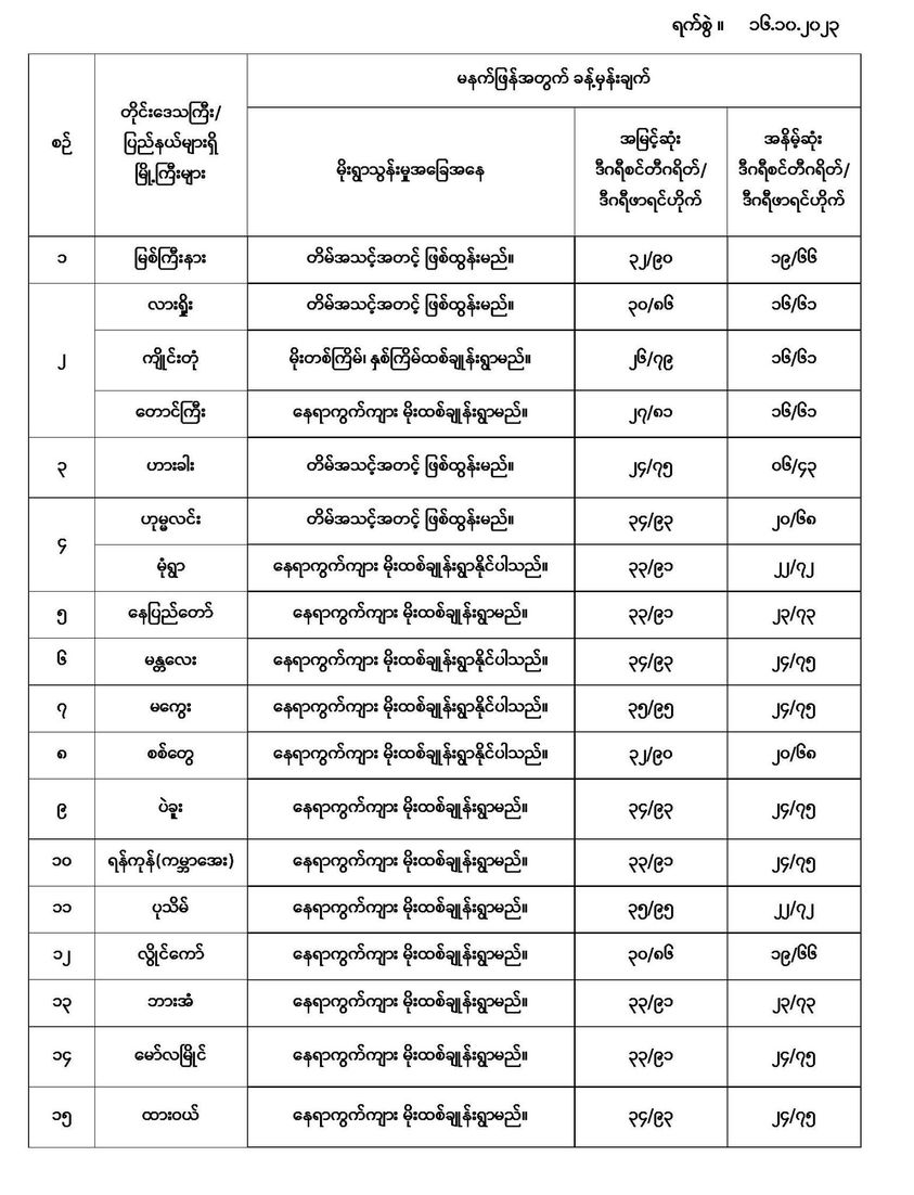 အောက်မှာဖော်ပြထားတာကတော့ မနက်ဖြန်အတွက် တိုင်းဒေသကြီးနှင့် ပြည်နယ်များရှိ မြို့ကြီးများ၏ အမြင့်ဆုံးအပူချိန်၊ အနိမ့်ဆုံးအပူချိန်နှင့် မိုးလေဝသခန့်မှန်းချက်တို့ပဲဖြစ်ပါတယ်---