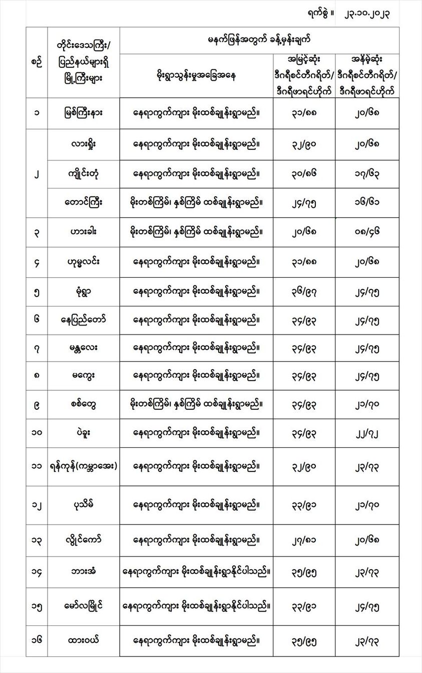 အောက်မှာဖော်ပြထားတာကတော့ မနက်ဖြန်အတွက် တိုင်းဒေသကြီးနှင့် ပြည်နယ်များရှိ မြို့ကြီးများ၏ အမြင့်ဆုံးအပူချိန်၊ အနိမ့်ဆုံးအပူချိန်နှင့် မိုးလေဝသခန့်မှန်းချက်တို့ပဲဖြစ်ပါတယ်---