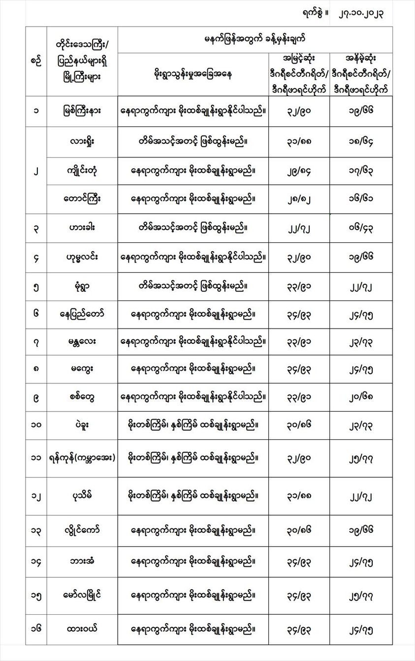 အောက်မှာဖော်ပြထားတာကတော့ မနက်ဖြန်အတွက် တိုင်းဒေသကြီးနှင့် ပြည်နယ်များရှိ မြို့ကြီးများ၏ အမြင့်ဆုံးအပူချိန်၊ အနိမ့်ဆုံးအပူချိန်နှင့် မိုးလေဝသခန့်မှန်းချက်တို့ပဲဖြစ်ပါတယ်---