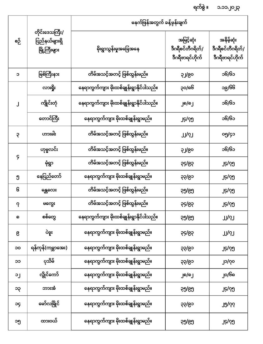 အောက်မှာဖော်ပြထားတာကတော့ မနက်ဖြန်အတွက် တိုင်းဒေသကြီးနှင့် ပြည်နယ်များရှိ မြို့ကြီးများ၏ အမြင့်ဆုံးအပူချိန်၊ အနိမ့်ဆုံးအပူချိန်နှင့် မိုးလေဝသခန့်မှန်းချက်တို့ပဲဖြစ်ပါတယ်---