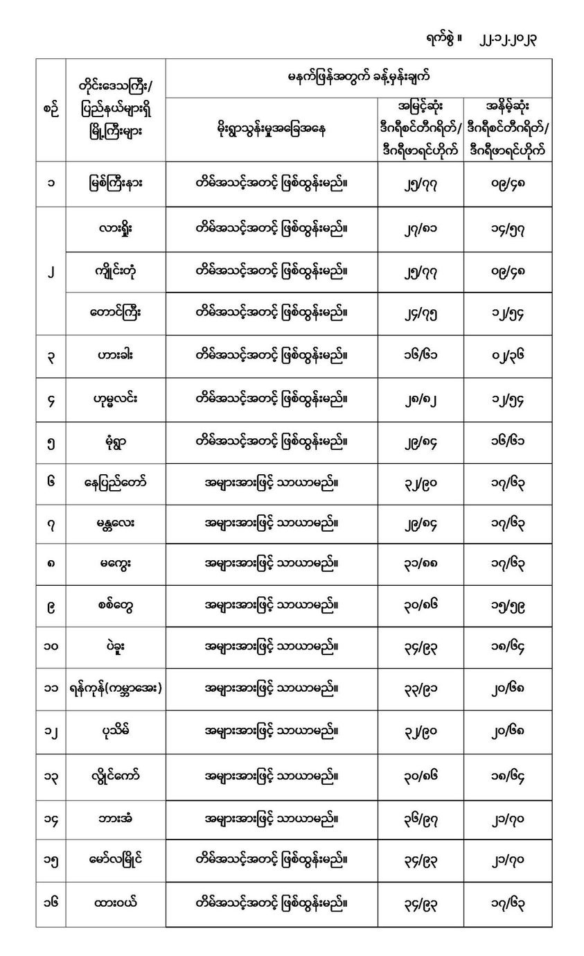 အောက်မှာဖော်ပြထားတာကတော့ မနက်ဖြန်အတွက် တိုင်းဒေသကြီးနှင့် ပြည်နယ်များရှိ မြို့ကြီးများ၏ အမြင့်ဆုံးအပူချိန်၊ အနိမ့်ဆုံးအပူချိန်နှင့် မိုးလေဝသခန့်မှန်းချက်တို့ပဲဖြစ်ပါတယ်-------