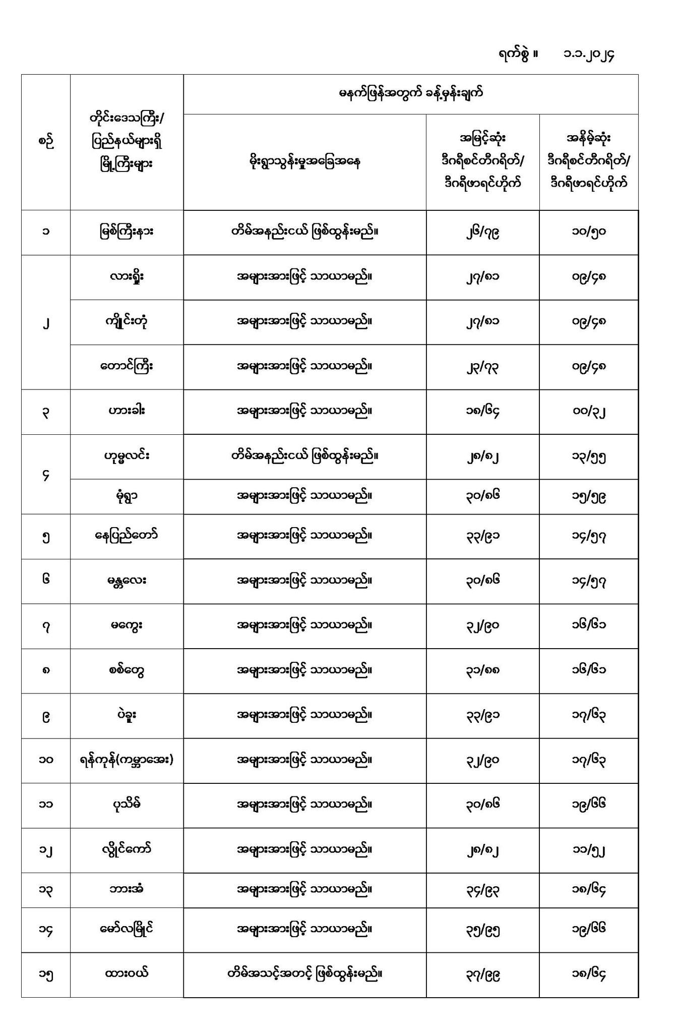 အောက်မှာဖော်ပြထားတာကတော့ မနက်ဖြန်အတွက် တိုင်းဒေသကြီးနှင့် ပြည်နယ်များရှိ မြို့ကြီးများ၏ အမြင့်ဆုံးအပူချိန်၊ အနိမ့်ဆုံးအပူချိန်နှင့် မိုးလေဝသခန့်မှန်းချက်တို့ပဲဖြစ်ပါတယ်-------