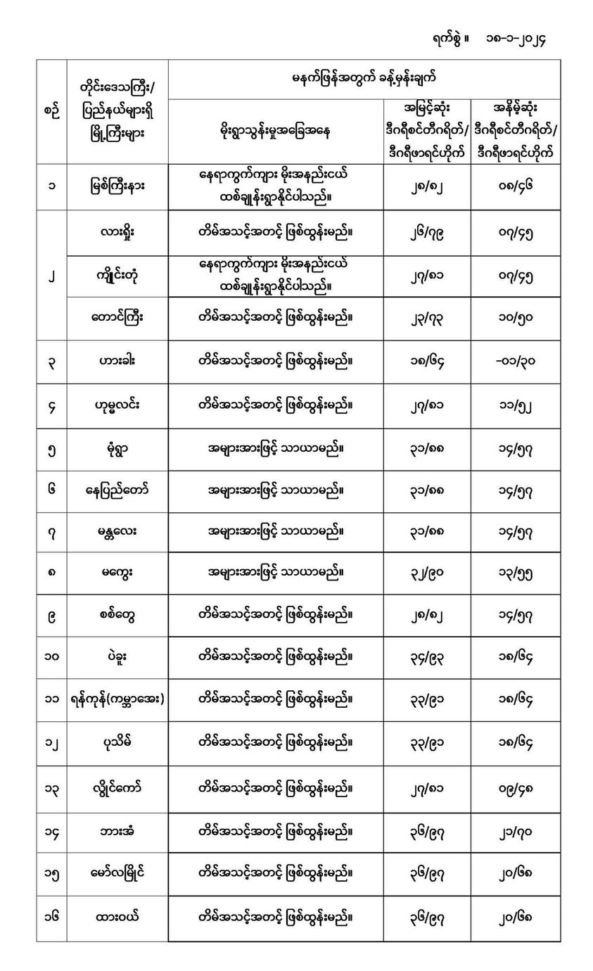 အောက်မှာဖော်ပြထားတာကတော့ မနက်ဖြန်အတွက် တိုင်းဒေသကြီးနှင့် ပြည်နယ်များရှိ မြို့ကြီးများ၏ အမြင့်ဆုံးအပူချိန်၊ အနိမ့်ဆုံးအပူချိန်နှင့် မိုးလေဝသခန့်မှန်းချက်တို့ပဲဖြစ်ပါတယ်-----