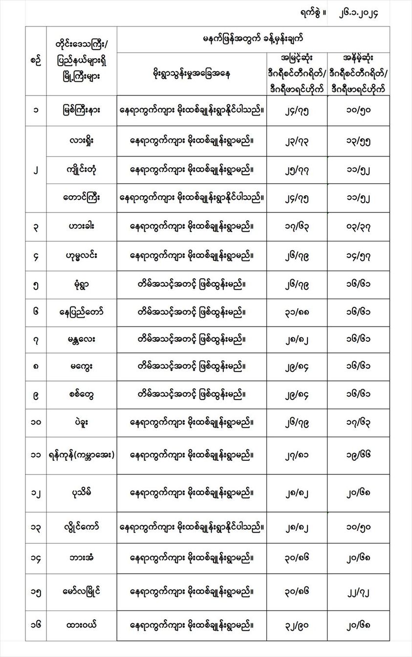 အောက်မှာဖော်ပြထားတာကတော့ မနက်ဖြန်အတွက် တိုင်းဒေသကြီးနှင့် ပြည်နယ်များရှိ မြို့ကြီးများ၏ အမြင့်ဆုံးအပူချိန်၊ အနိမ့်ဆုံးအပူချိန်နှင့် မိုးလေဝသခန့်မှန်းချက်တို့ပဲဖြစ်ပါတယ်---
