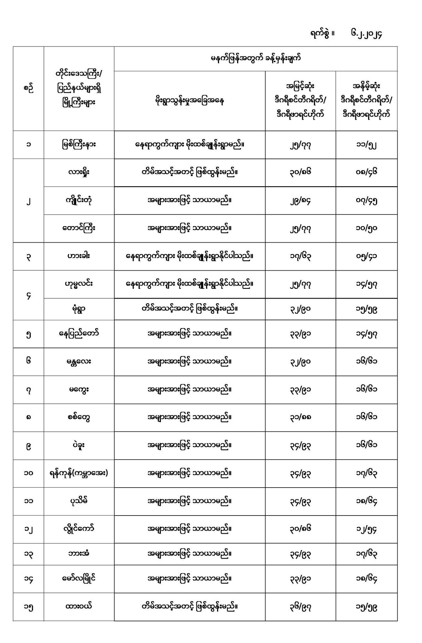 အောက်မှာဖော်ပြထားတာကတော့ မနက်ဖြန်အတွက် တိုင်းဒေသကြီးနှင့် ပြည်နယ်များရှိ မြို့ကြီးများ၏ အမြင့်ဆုံးအပူချိန်၊ အနိမ့်ဆုံးအပူချိန်နှင့် မိုးလေဝသခန့်မှန်းချက်တို့ပဲဖြစ်ပါတယ်---