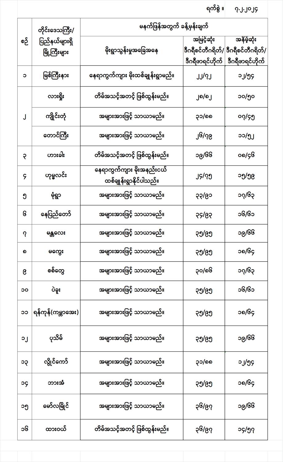 အောက်မှာဖော်ပြထားတာကတော့ မနက်ဖြန်အတွက် တိုင်းဒေသကြီးနှင့် ပြည်နယ်များရှိ မြို့ကြီးများ၏ အမြင့်ဆုံးအပူချိန်၊ အနိမ့်ဆုံးအပူချိန်နှင့် မိုးလေဝသခန့်မှန်းချက်တို့ပဲဖြစ်ပါတယ်---