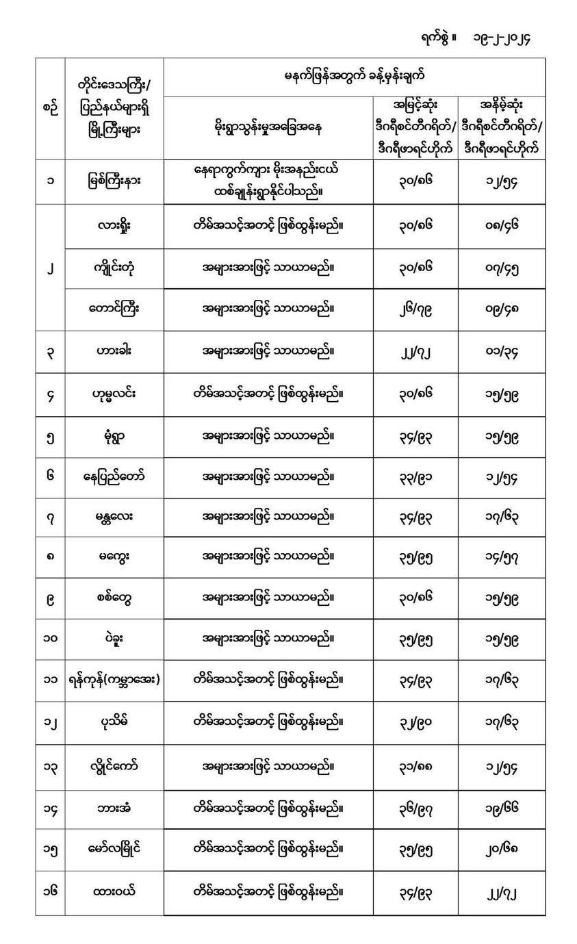 အောက်မှာဖော်ပြထားတာကတော့ မနက်ဖြန်အတွက် တိုင်းဒေသကြီးနှင့်ပြည်နယ်များရှိ မြို့ကြီးများ၏ အမြင့်ဆုံးအပူချိန်၊ အနိမ့်ဆုံးအပူချိန်နှင့် မိုးလေဝသခန့်မှန်းချက်တို့ပဲဖြစ်ပါတယ်---