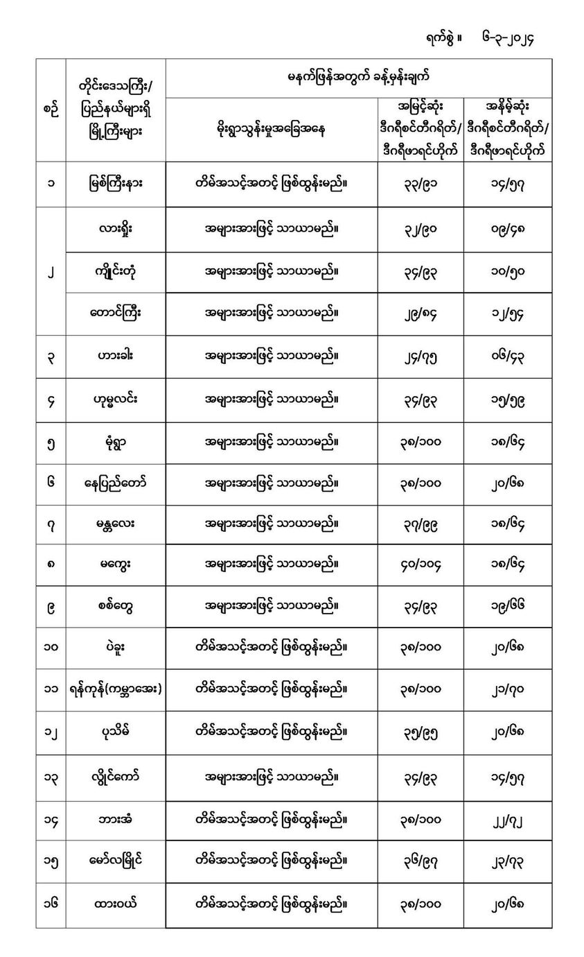 အောက်မှာဖော်ပြထားတာကတော့ မနက်ဖြန်အတွက် တိုင်းဒေသကြီးနှင့်ပြည်နယ်များရှိ မြို့ကြီးများ၏ အမြင့်ဆုံးအပူချိန်၊ အနိမ့်ဆုံးအပူချိန်နှင့် မိုးလေဝသခန့်မှန်းချက်တို့ပဲဖြစ်ပါတယ်----