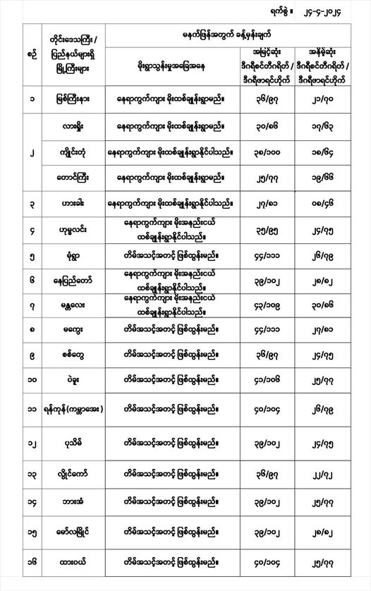 အောက်မှာဖော်ပြထားတာကတော့ မနက်ဖြန်အတွက် တိုင်းဒေသကြီးနှင့် ပြည်နယ်များရှိ မြို့ကြီးများ၏ အမြင့်ဆုံးအပူချိန်၊ အနိမ့်ဆုံးအပူချိန်နှင့် မိုးလေဝသခန့်မှန်းချက်တို့ပဲဖြစ်ပါတယ်---