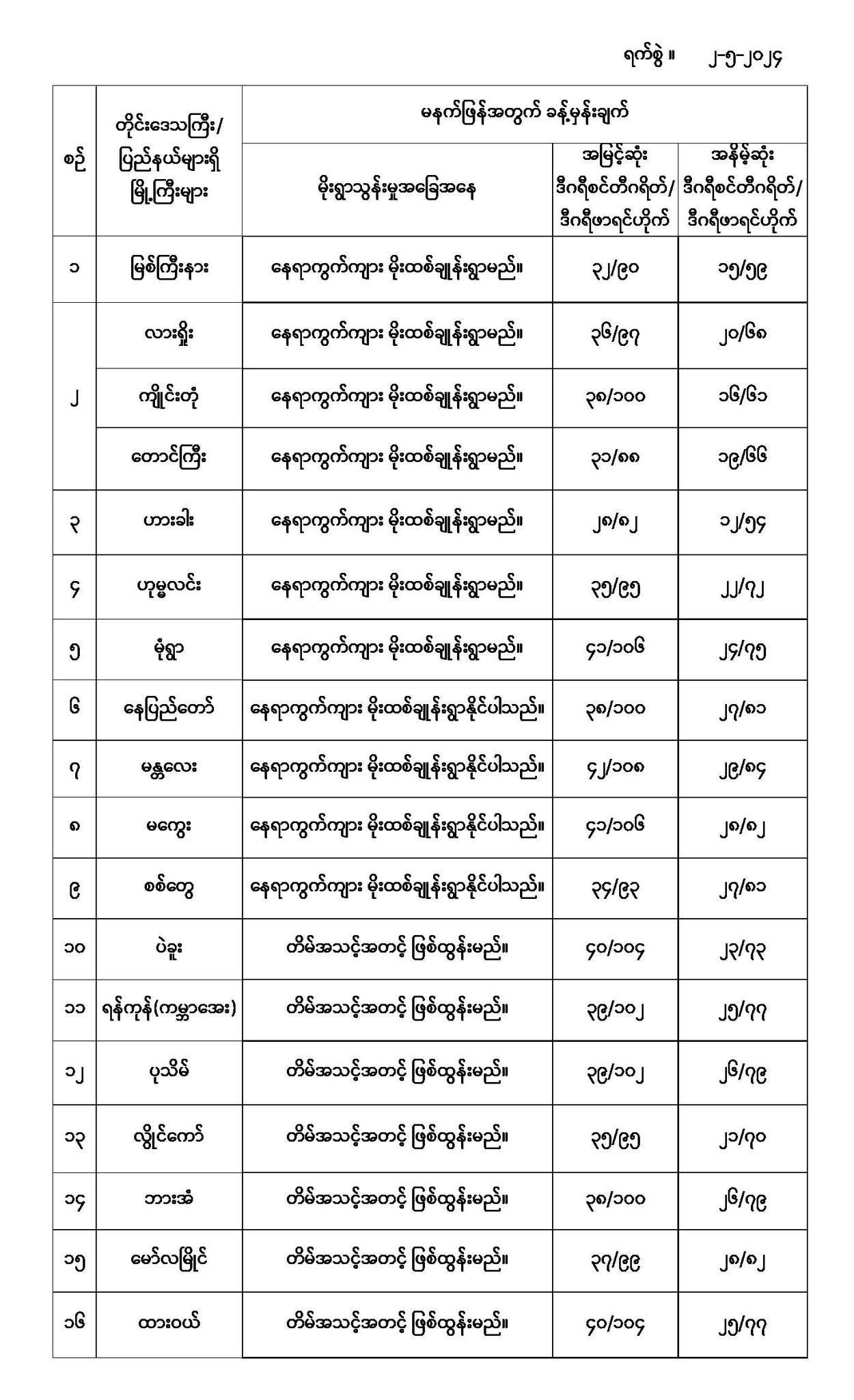 အောက်မှာဖော်ပြထားတာကတော့ မနက်ဖြန်အတွက် တိုင်းဒေသကြီးနှင့် ပြည်နယ်များရှိ မြို့ကြီးများ၏ အမြင့်ဆုံးအပူချိန်၊ အနိမ့်ဆုံးအပူချိန်နှင့် မိုးလေဝသခန့်မှန်းချက်တို့ပဲဖြစ်ပါတယ်---