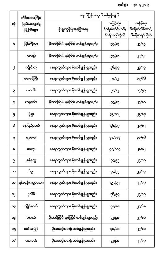 မနက်ဖြန်အတွက် တိုင်းဒေသကြီးနှင့် ပြည်နယ်များရှိ မြို့ကြီးများ၏ အမြင့်ဆုံးအပူချိန်၊ အနိမ့်ဆုံးအပူချိန်နှင့် မိုးလေဝသခန့်မှန်းချက်တို့ပဲဖြစ်ပါတယ်---