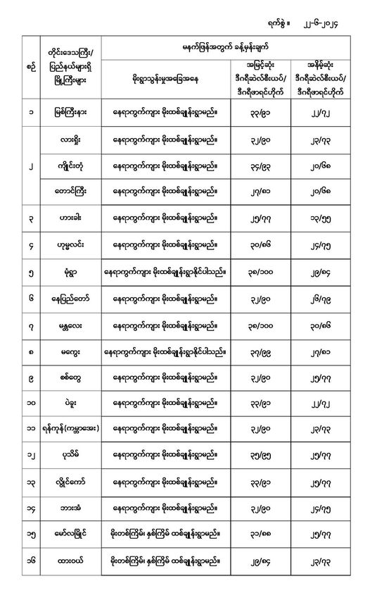 မနက်ဖြန်အတွက် တိုင်းဒေသကြီးနှင့် ပြည်နယ်များရှိ မြို့ကြီးများ၏ အမြင့်ဆုံးအပူချိန်၊ အနိမ့်ဆုံးအပူချိန်နှင့် မိုးလေဝသခန့်မှန်းချက်တို့ပဲဖြစ်ပါတယ်---