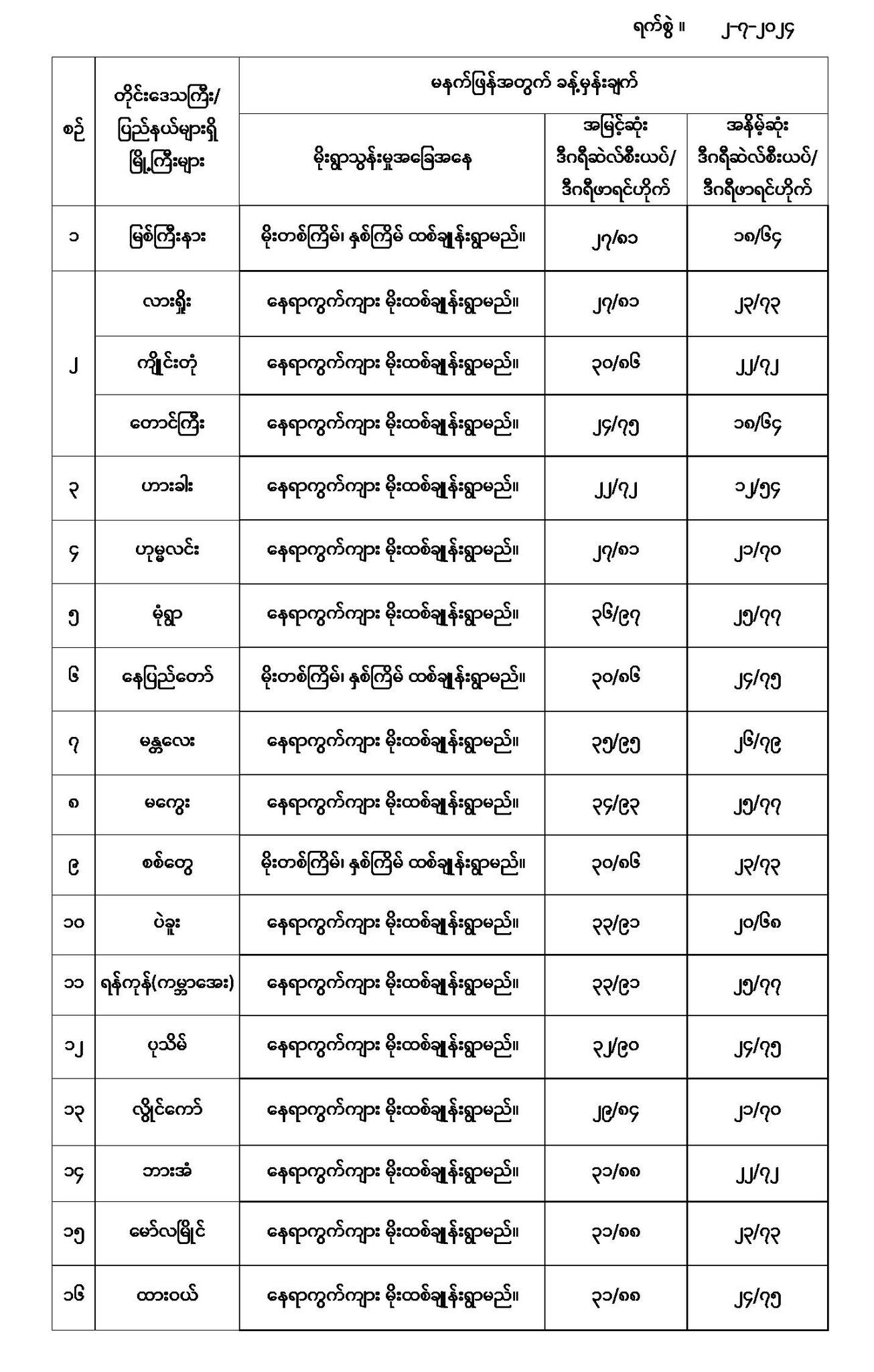မနက်ဖြန်အတွက် တိုင်းဒေသကြီးနှင့် ပြည်နယ်များရှိ မြို့ကြီးများ၏ အမြင့်ဆုံးအပူချိန်၊ အနိမ့်ဆုံးအပူချိန်နှင့် မိုးလေဝသခန့်မှန်းချက်တို့ပဲဖြစ်ပါတယ်---