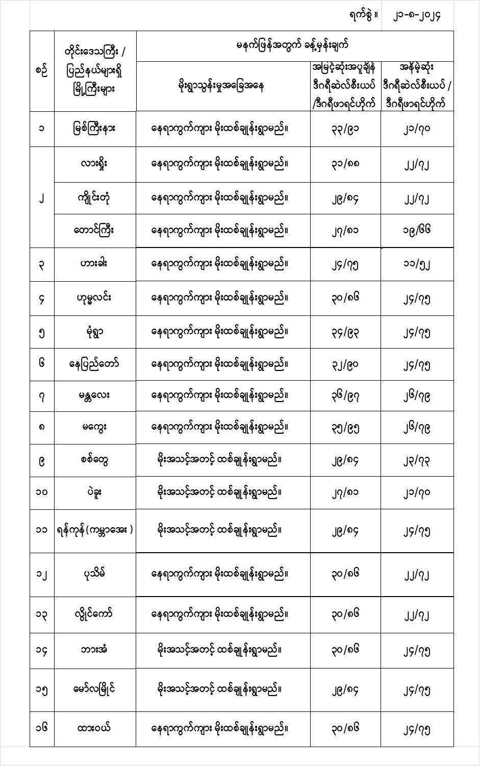 မနက်ဖြန်အတွက် တိုင်းဒေသကြီးနှင့် ပြည်နယ်များရှိ မြို့ကြီးများ၏ အမြင့်ဆုံးအပူချိန်၊ အနိမ့်ဆုံးအပူချိန်နှင့် မိုးလေဝသခန့်မှန်းချက်တို့ပဲဖြစ်ပါတယ်---